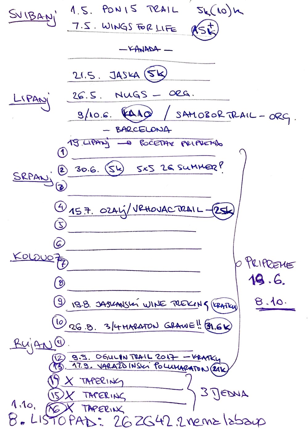 Opet, napraviti smisleni plan, uz dostupnu tehnologiju, savjete prijatelja, trenera u klubu, i literaturu koja mi stoji pored ruke na radnom stolu – Abeceda trčanja, bilo je lakši dio posla. Ispalo je 5 treninga tjedno sa nekih 60-65 kilometra tjedno što je malo ispod nekog minimuma koji se preporučuje, a to je da trčite tjedno barem duplu kilometražu od dužine utrke za koju se spremate. Opremu sam imao, iako sam tijekom priprema “ubio” jedne, “iscrpio” (doveo ih na 600 km) druge i naručio treće tenisice za trčanje, a tehničkih majica za trčanje i ostalih stvari imam pun ormar.