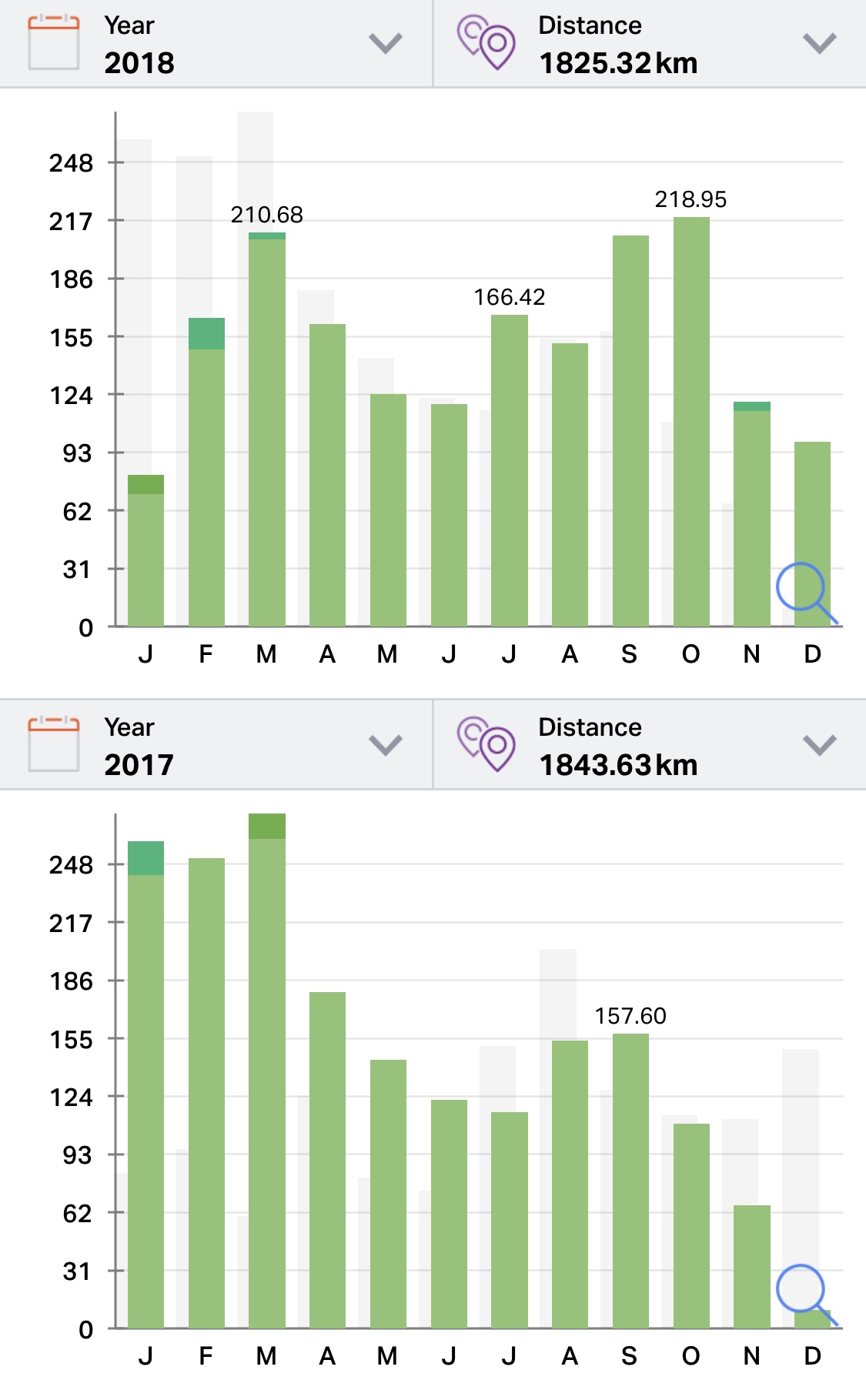 Aplikacije u kojima bilježim svoje treninge i uspoređujem korisnost i uspješnost istih su Strava, na kojoj imamo i klupsku tablicu (grupu), zatim osnovna Garmin Connect, zbog sata za trčanje koji koristim – Garmin Fenix 5X te Endomondo, koju koristim već 6 sezona, i stoga je odlična za komparaciju nekakvih dostignuća i napretka (ako i kada ga ima). Dakle, kažu one, slično: ukupno 210 aktivnosti, kada se računa trčanje, bicikl i cardio treninzi, koje sam tek u posljednja dva mjeseca 2018. počeo bilježiti sa satom. Pretrčao sam 1825,32 kilometra, prešao biciklom još 964,66 kilometara.Trčanje je bilo u 166 treninga i utrka, što daje prosjek od otprilike 11 kilometara po aktivnosti. Na biciklu sam prešao nešto manje od tisuću kilometara u svega 37 aktivnosti ove sezone, sa prosjekom od 26 kilometara po aktivnosti. U totalu to daje 2782,52 kilometara u 203 aktivnosti (u filmiću govori o 199?), što je nekih skoro 200 kilometara manje nego u 2017. Uglavnom nedostaju biciklistički, jer je trčanje gotovo na razini prošle godine, sa razlikom od 15-ak kilometara.