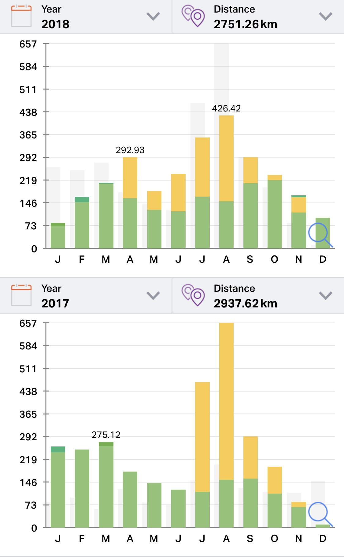 I na kraju, vidljivo je kretanje kilometara od 2014. kada sam bicikl zamjenio sa trčanjem i mislim da su za mene, koji sam rekreativac, ovo već sasvim ozbiljne kilometraže, no zadao sam si neke ciljeve za sljedeće godinu i uvijek i opet samo nema labavo!