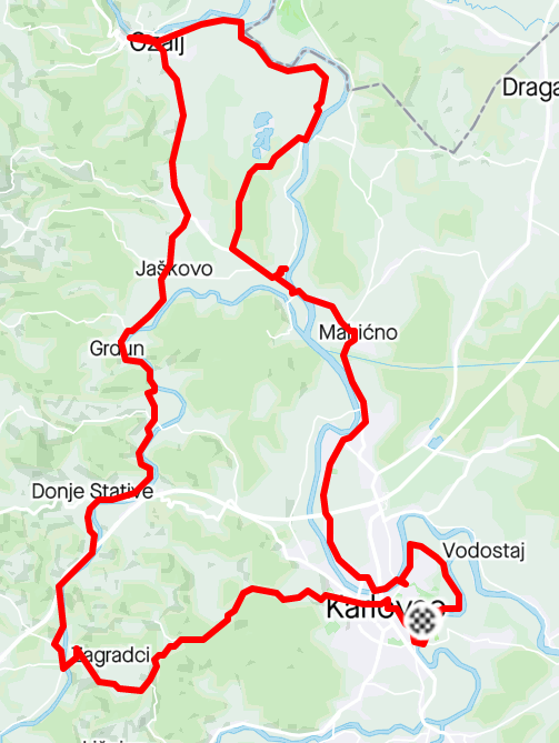 Nakon kratkog obilaska ovog impresivnog zdanja, spustili smo se do Ozlja i obližnjih kafića, gdje smo napravili pravu okrjepu, sa kavom i hladnom tekućinom, a napunili smo bidone sa kupljenim izotoničnim pićima na obližnjem Petrolu, koji je nasuprot spomenutih kafića. To je bilo otprilike na polovini rute, nakon sat i pol vožnje uz zadovoljavajući prosjek od preko 23 km/h, s obzirom da nas je u drugoj polovini čekalo dosta uspona, pogotovo između 50. i 55. kilometra nakon uspona na stari grad Novigrad i vožnju pored malih naselja na obroncima na zapadu u odnosu na grad Karlovac.
