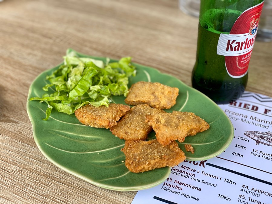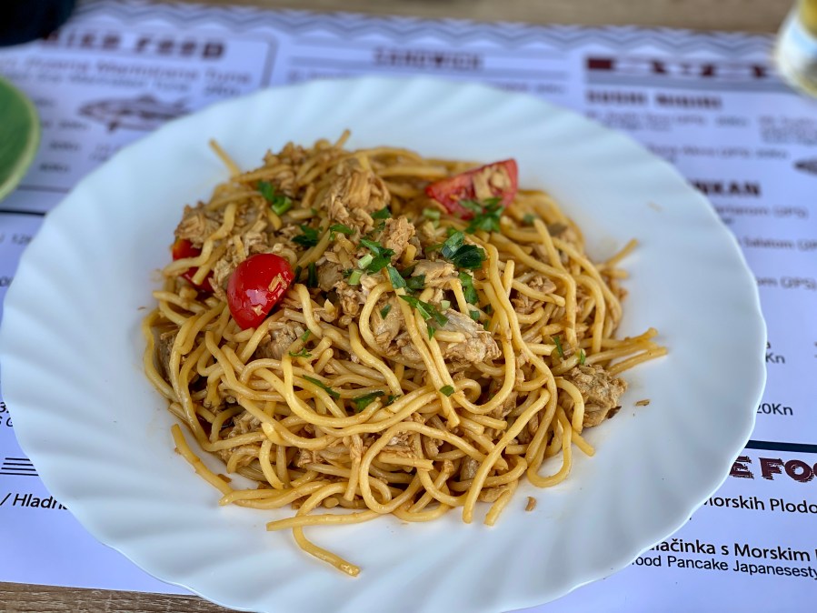 Vratimo se našem mjestu ručka jučer, danas, vjerojatno ne i sutra, s obzirom na plan sa cjelodnevnim transotočkim izletom do iza Tkona, sve do plaže Sovinje na Pašmanu. Radi se o malom restorančiću, nedaleko spomenute luke sa ribarskim koćaricama sa fotografija iznad. Srdela Snack. Jučer najjednostavnije srdele i krumpir salata, danas mali komadići marinirane i panirane tune, te špagete sa rajčicom i tunom. Ništa puno, ništa razvikano, a cijene su takve da bi nas paketić srdela iz zamrzivača ili komad tune iz obližnjeg trgovačkog centra, ne uzimajući vrijeme za pripremu, vjerojatno koštao isto ili više od 20 kuna po porciji, koliko je cijena većine jela iz ponude u ovom meniju. Svaka pohvala!