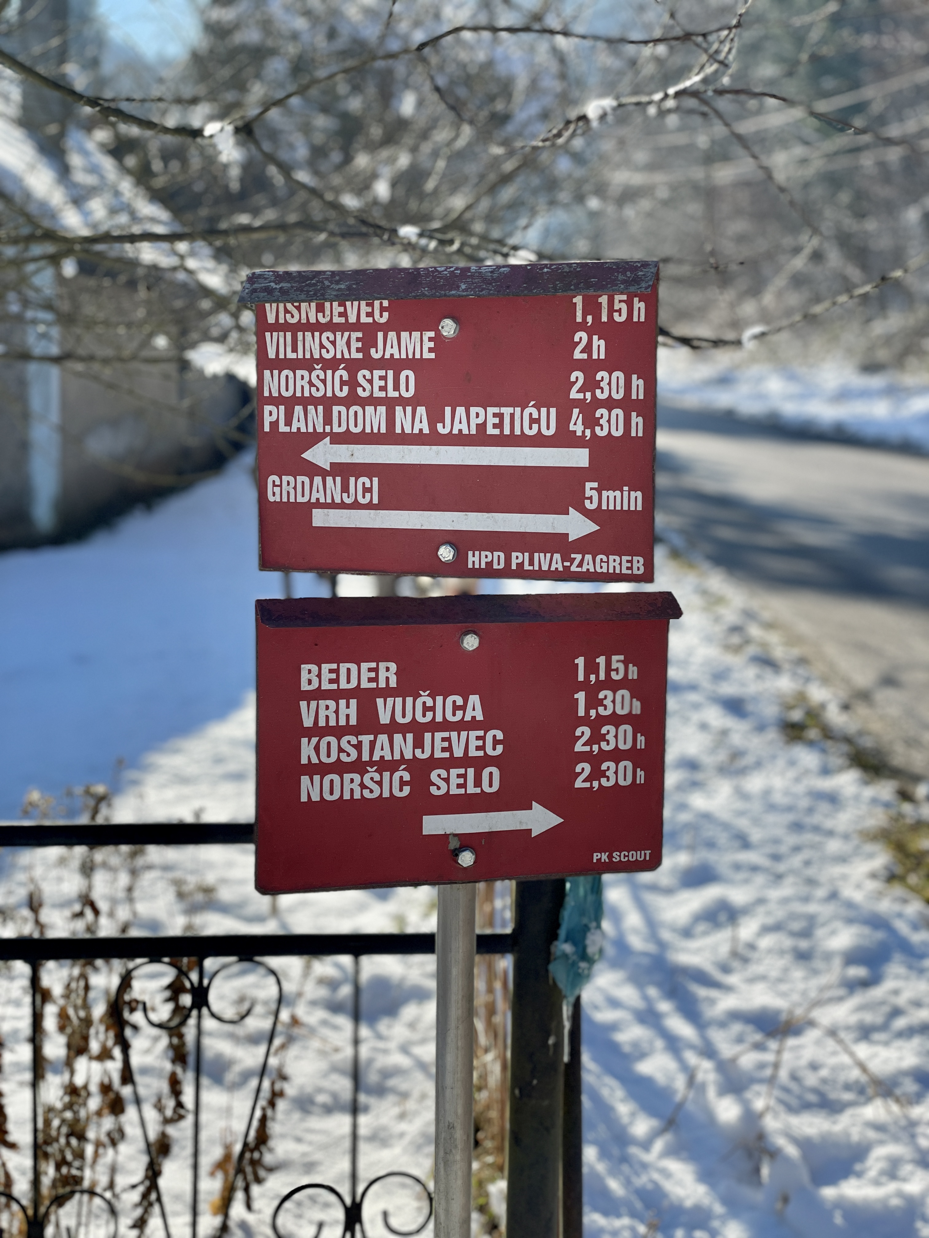 Nakon okrjepe, divljom svježom i prerađenom tekućom šljivom, krenuli smo poljima, do ulaska u šumu i uspon oko 610 metara visokog Huma, gdje smo nakon kilometra po ledenom i smrznutom makadamu zakrenuli natrag prema selu Beder i Grdanjcima, kroz predivnu, netaknutu, snijegom prekrivenu stazu, uglavnom nizbrdo. Nakon nešto manje od 30 minuta od velike zalihe narezane grabovine za trening šampiona, stigli smo do sela Beder, sa jugozapadne strane. Beder je naselje koje se nalazi u sastavu Grada Samobora, Zagrebačka županija. Površina naselja iznosi 4,02 km2. Prema popisu stanovništva iz 2011. godine, naselje je imalo 83 stanovnika, te 38 obiteljskih kućanstava (prema popisu iz 2001). Dakle, nešto je veće od susjednog Javoreka, s kojim je povezan jedinom cestom. Nakon prolaska sela, iza zadnje kuće, skrenuli smo niz blatnu cestu, prekrivenu snijegom, prema 50 minuta udaljenim Grdanjcima. Prekrasne vizure kroz šumu i snijeg koji se lagano topio na sada već 2 stupnja C. U Grdanjce smo ušli sa južne strane.