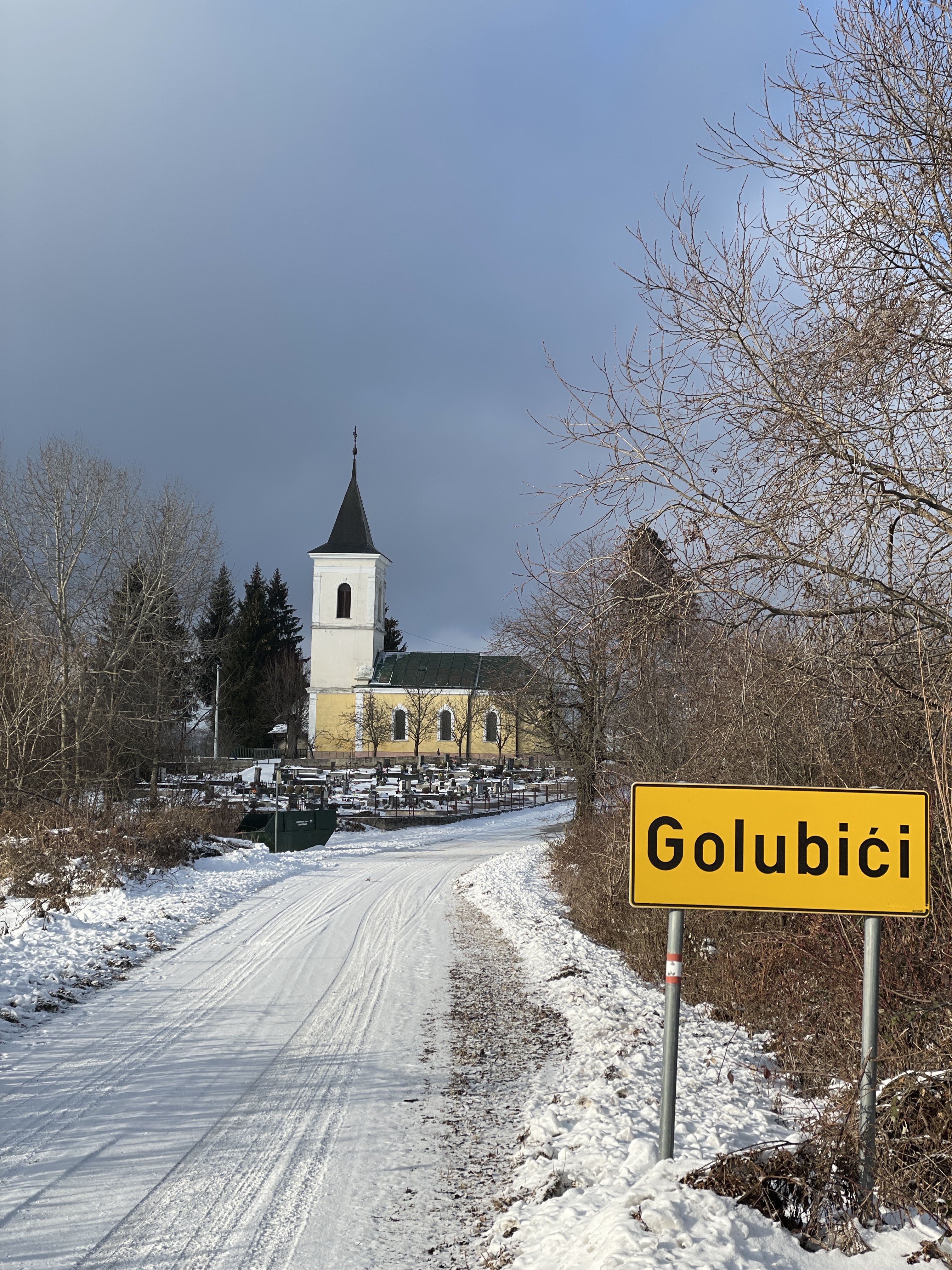 I tak…rekoh u srijedu da ćemo na Žumberak u subotu, red je da bude tako, i bilo je! Potpuno nova ruta iz malog sela Golubići. No, avantura je prvo doći do polazne točke. Sjeli smo u naš Crosslander i krenuli put Koretića sa idejom da se popnemo do Golubića makadamom pored Šimraka i Delivuka. Odličan “betonirani”, slabo posut solju makadam, no dovoljno širok da nije bilo bojazni od nekog proklizavanja. Nakon 45 minuta vožnje od Samobora, stigli smo do polazišne točke i krenuli. Golubići se nalaze u istočnom dijelu Žumberka, a pripadaju pod grad Samobor. U Golubićima se nalazi gkt. crkva sv. Ivana Krstitelja, a nekadašnja školska zgrada je obnovljena i služi za razna okupljanja u ovom dijelu Žumberka. Po mjestopisu Julija Frasa iz 1835. u Golubićima (Grabar) bilo je 12 kuća i 143 grkosjedinjena stanovnika. Golubići su najviše stanovnika imali 1931.god. i to 276, a po zadnjem popisu imaju svega 17 stanovnika.