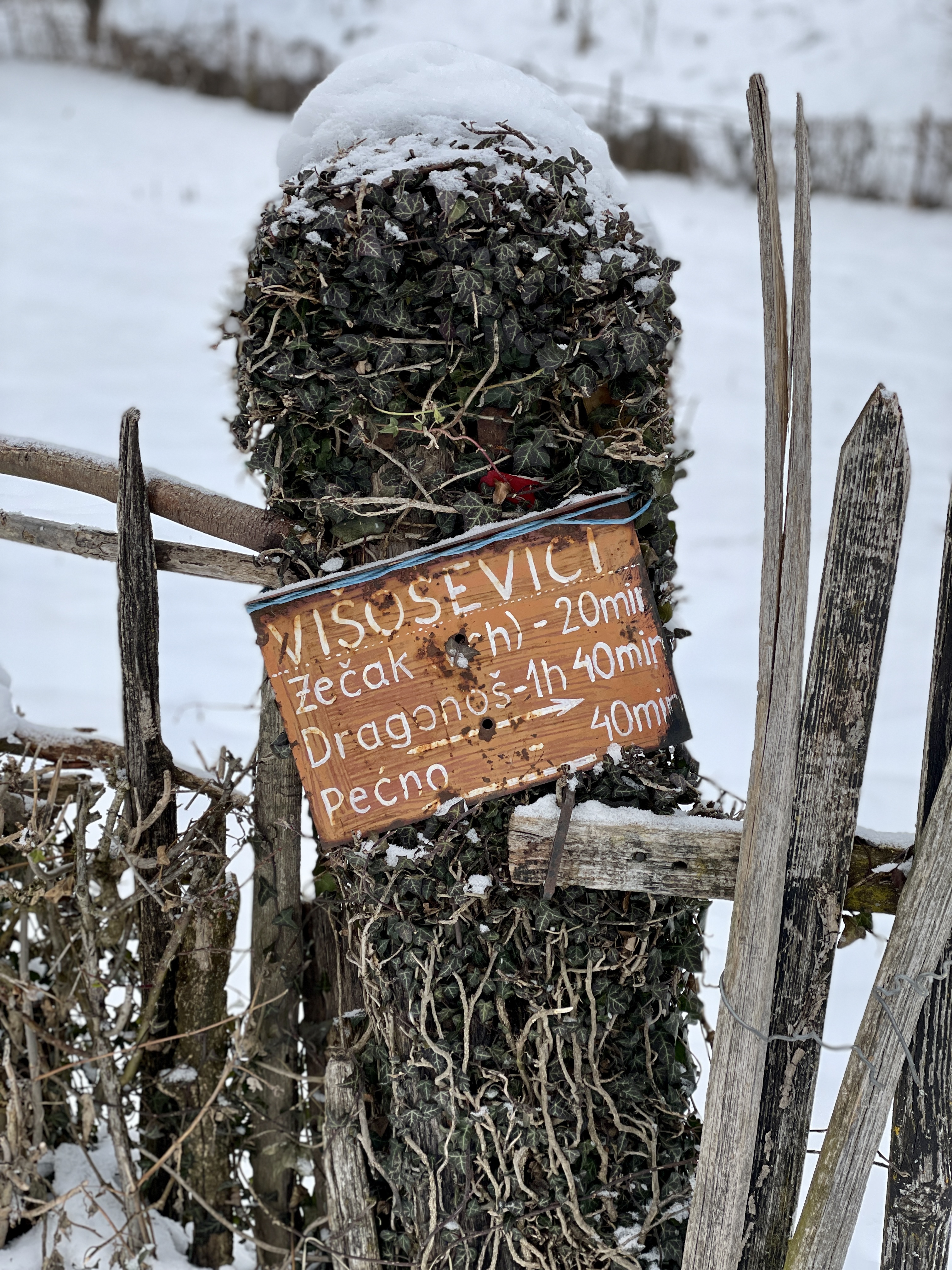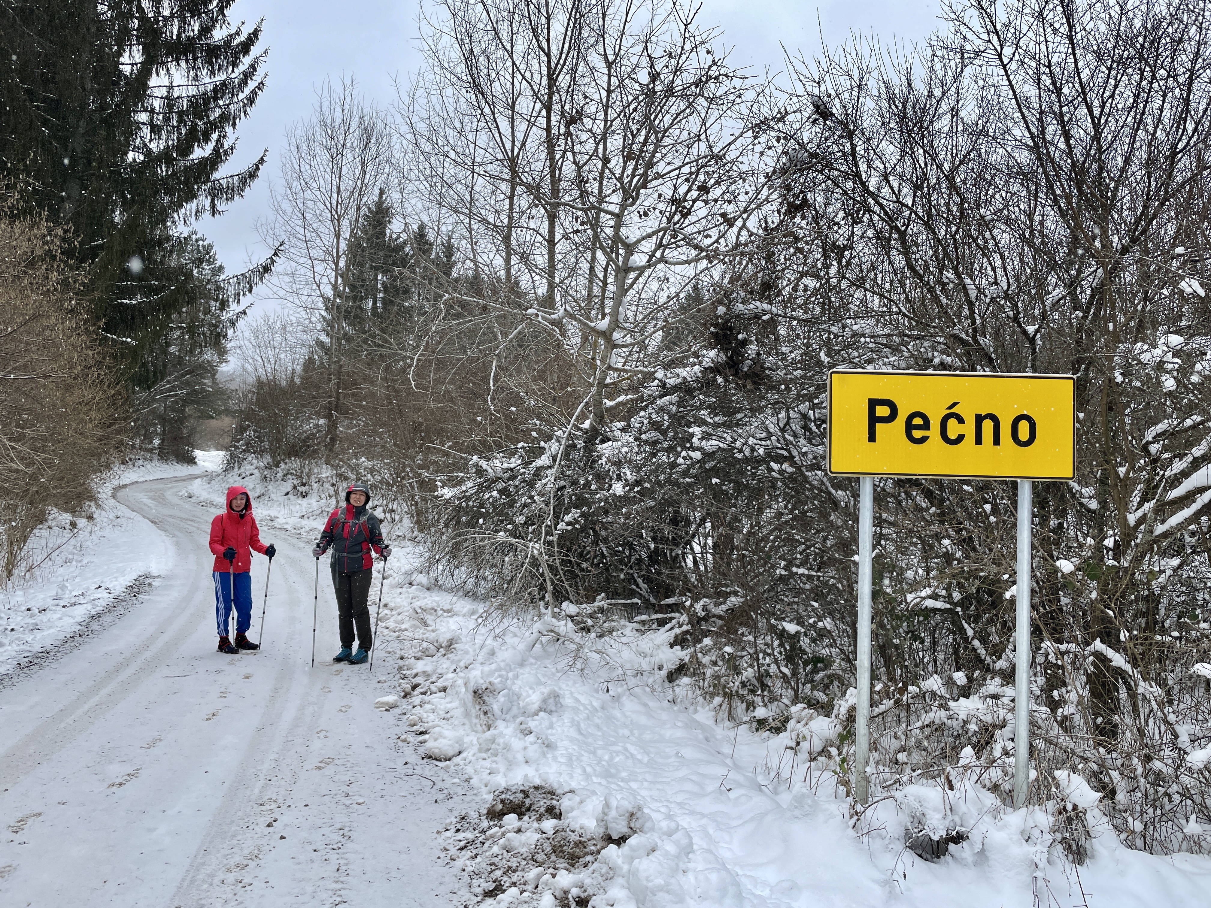 Krenuli smo prema zapadu, cestom koja je potpuno sleđena, tvrda, no rubovi sa lišćem nisu klizavi. Bilo je to najbržih ovosezonskih prvih 5 kilometara, gotovo sve nizbrdo, za što nam je trebalo malo više od jednog sata. Inače je tempo davala i Erica, koja je danas išla sa nama. Prošli smo pored sela Rajići, do “dna” našeg spusta od nekih 6,5 kilometara, kada je krenula uzbrdica, nekako sa ulaskom u Pećno, selo koje naočigled čeka potpuna elektrifikacija, s obzirom na broj novih betonskih “bandera”. Naselje Pećno smješteno je sjeverno od doline Slapnice i jugoistočno od šume Kremenjaka, na prostranoj valovitoj visoravni, na nadmorskoj visini od oko 600 m. Sastoji se od jedanaest idiličnih zaselaka: Stića, Grubača, Kraića, Bratičića, Prevoda, Goljaka, Posinaka, Staničića, Đurića, Čučića i Pećna kao središta i zajedničkog naziva naselja.Unatoč tome sto su zaselci razbaci po brežuljcima oni tvore jednu etnografsku cjelinu i nastali su djeljenjem obiteljskih zadruga. U samom središtu naselja nalazi se zgrada bivše škole i kućica gdje je nekada bila trgovina. U blizini je župni dvor i grkokatolička crkva Uznesenja Marijina, a koja je sagrađena 1764. godine.