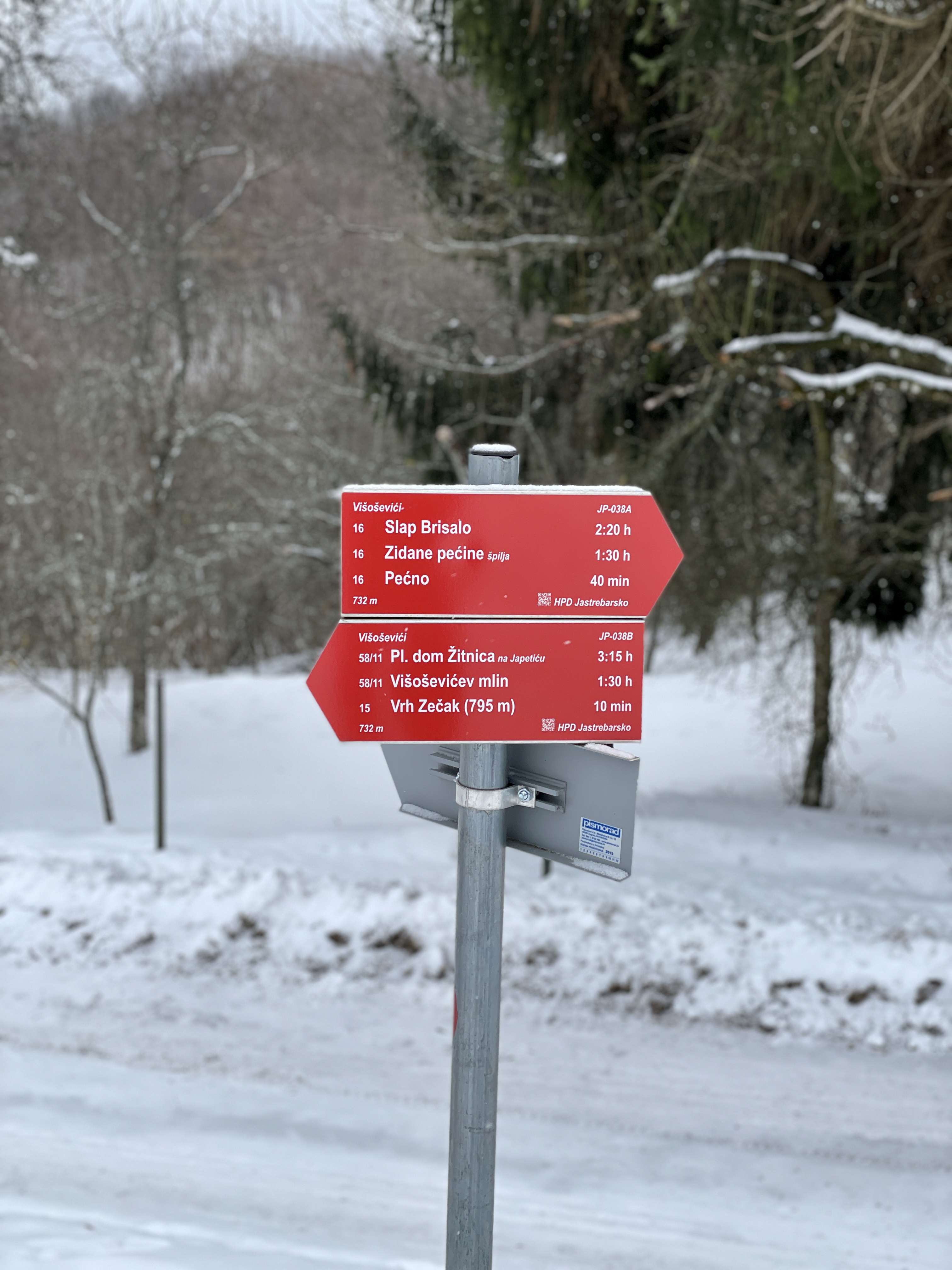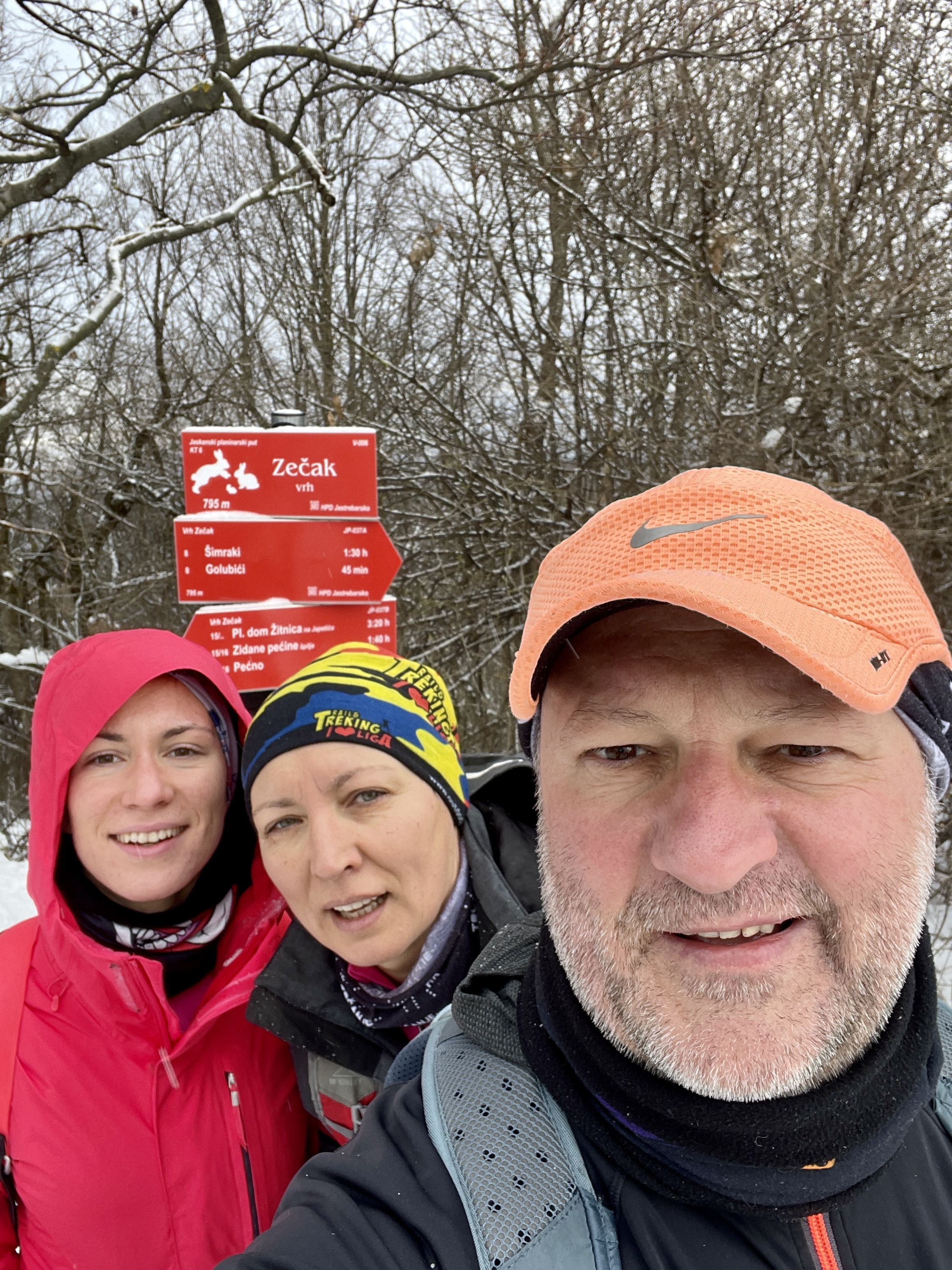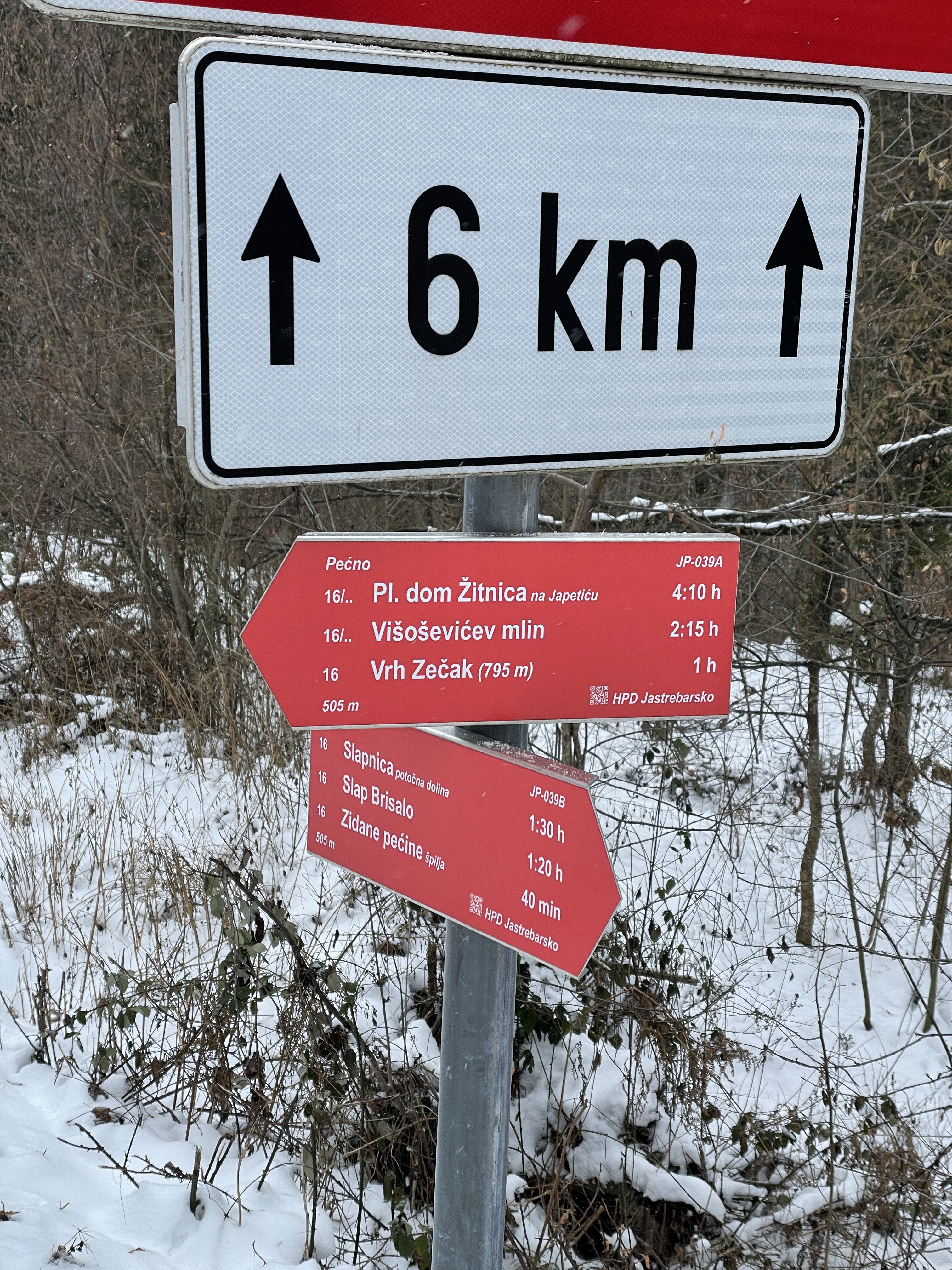 Iz Pećna nas je ruta vodila uzbrdo, dok nismo sa ceste skrenuli udesno Jaskanskim planinarskim putem, put Zečaka, do kojeg je od te table bilo točno sat uspona. Danas je tamo bilo desetak centimetara sipkog, suhog snijega, koji nije pomagao u usponu. U nešto više od dva kilometra, trebalo je savladati nekih 300 metara uspona. Prije samog “vrha”, koji to baš i nije, jer je na rubu jedne oranice, pružaju se prekrasni vidici na Samoborsko gorje i šampiona Japetića, koji je danas bio u oblaku. Protrčali smo kroz ciljnu ravninu uspona za danas, tih 795 metara koliko je Zečak nad morem i odmah krenuli dalje, sjevernom padinom, prema selu Pavkovići. Zečak je osamljen travnat vrh u istočnom dijelu žumberka i ujedno jedan od najljepših žumberačkih vidikovaca. Vrh je prostrana zaravan s koje se pružaju vidici na sve strane. Hrbat Zečaka, koji se nastavlja na jug prema Slavetiću, predstavlja razvodnicu između Save i Kupe.