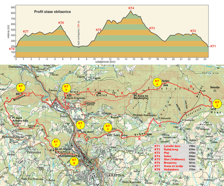 Ukupna dužina iznosi 24,5 km, visinska razlika 660m, ima 8 kontrolnih točaka; prva lovački dom, zadnja Hušnjakovo. Na mjestima kontrolnih točaka ugrađeni su metalni žigovi, a osim standardnim planinarskim markacijama trasa je dodatno označena slovom K.
