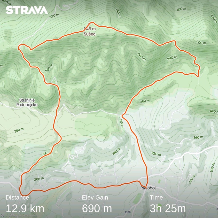 Spustivši se do dobro poznate nam ceste od Krapine, preko Trškog vrha, prema Radoboju, sa zapadne strane, prešli smo posljednja dva kilometra, zaokruživši rutu na 13 kilometara za gotovo 700 metara uspona. Još jednom, prekrasno provedena nedjelja, na prosječnih 6 stupnjeva Celzijevaca, prikladno odjeveni, sa odličnim Saucony trail tenisicama, uživali smo sva četiri sata našeg planinarenja zagorskom ljepoticom. Za svaku preporuku!