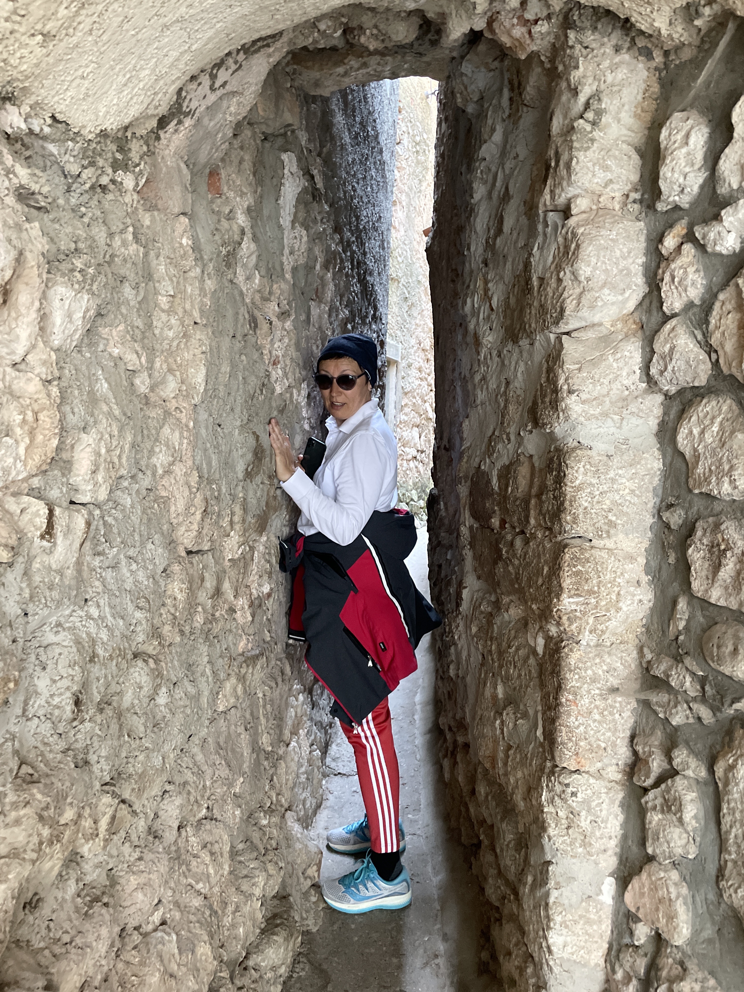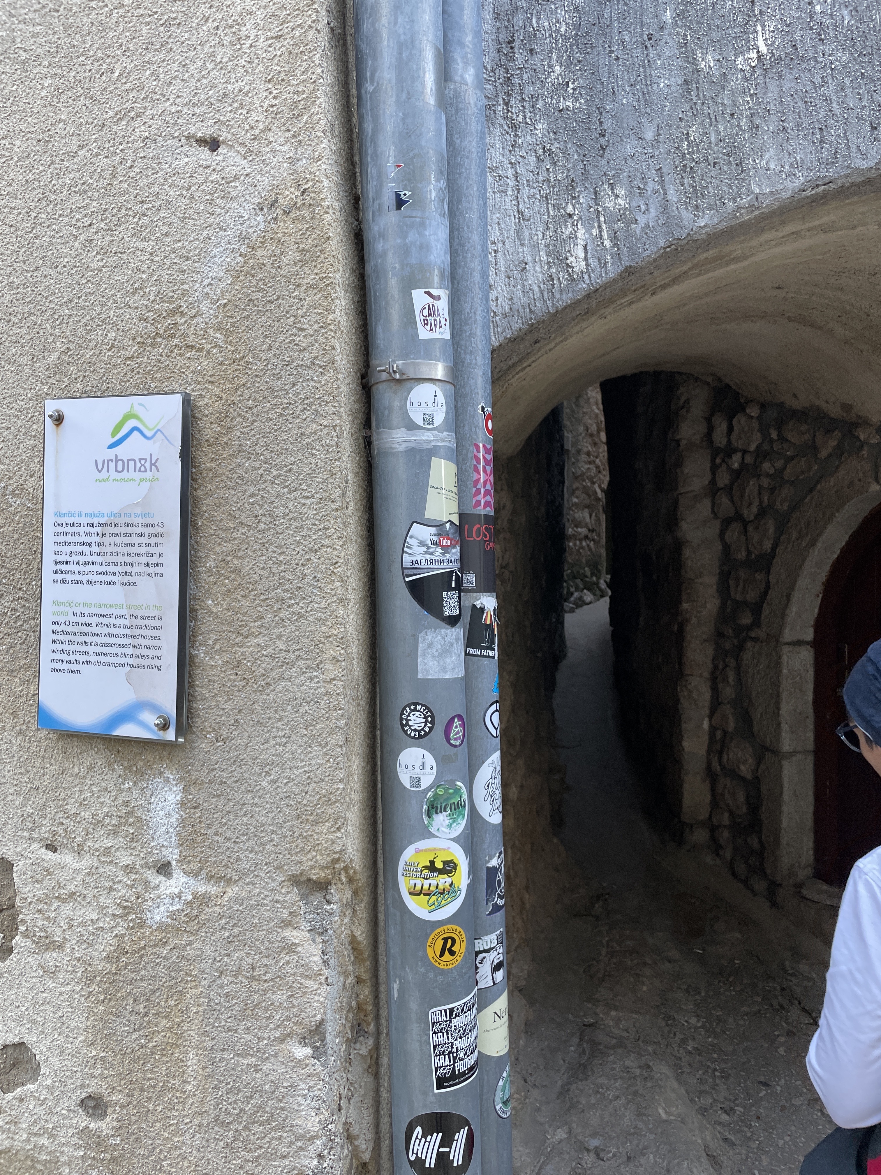 Slijedio je novi uspon, u jezgru starog grada, gdje je sve apsolutno pusto, što ćemo kasnije saznati, radio je samo restoran Gospoja, na glavnom trgu i caffee do njega. Da bismo došli do željene kavice, u restoranu Nada, koji se ispostavio također zatvorenim, no dobili smo gratis kavicu od gazdarice, morali smo proći neke zanimljivosti po kojima je Vrbnik također poznat. Radi sigurnosti pučanstva sve stambene zgrade bile su smještene unutar zidina, a u samo mjesto ulazilo se kroz dvoja vrata: Vela vrata i Mala vrata ili Dverčića – mala, kamena vratašca koja su toliko malena da je prvo pitanje koje si postavite kada ih ugledate da li su nekada na Vrbniku živjeli patuljci. Čak i ako niste visoki morat ćete se poprilično sagnuti da bi uspjeli proći kroz ta vratašca. Stoga oprez kada prolazite kroz Dverčića – nemojte se zaboraviti sagnuti jer vam je u protivnom neizbježan udarac glavom u stoljetni kamen. Ta vratašca koristili su stari žitelji Vrbnika koji su kroz njih ulazili kada bi zakasnili i našli zatvorena glavna vrata koja su se nalazila na Placi. Glavna vrata nekada su se nalazila na južnome rubu Place, nadomak crkvice sv. Martina i njih su svake večeri stražari zaključavali i nosili sucu ključeve grada.