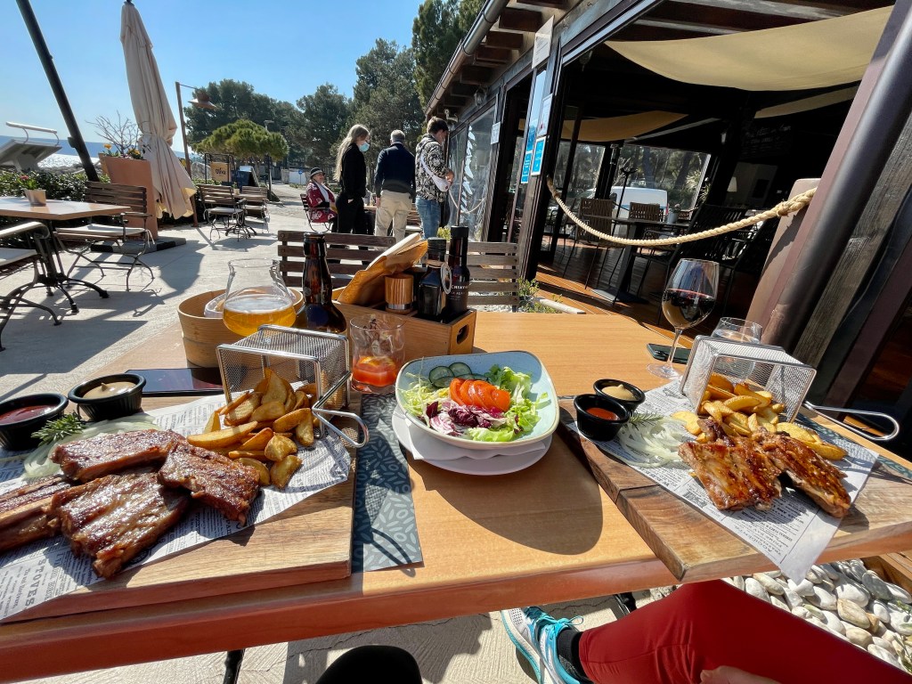 Nastavili smo u blizini jezera koje se nalazi nedaleko ceste. Jezero je smješteno nedaleko od Njivica, samo stotinjak metara od ceste koja spaja Omišalj i Malinsku. Kao najveće prirodno slatkovodno stanište otoka Krka, Jezero je iznimno važno radi očuvanja vrednota bioraznolikosti otoka Krka. Ponovno zahvativši komad 102-ke stigli smo do ulaza u Njivice, na malom rotoru ulica Draga i Primorske, gdje smo se spustili do terase vrlo ljubaznog domaćina, kojem nismo saznali niti ime, no počastio nas je kavicom i vodom, jer je otvorio (nadamo se) tek u petak. Time smo završili našu jutarnju rutu od 21,82 kilometra sa 306 m visinske. Slijedio je povratak autom u bazu u Krku i okrjepa u omiljenom grillu Oliva u kampu sa simpatičnim profesionalcem – konobarom Mladenom.