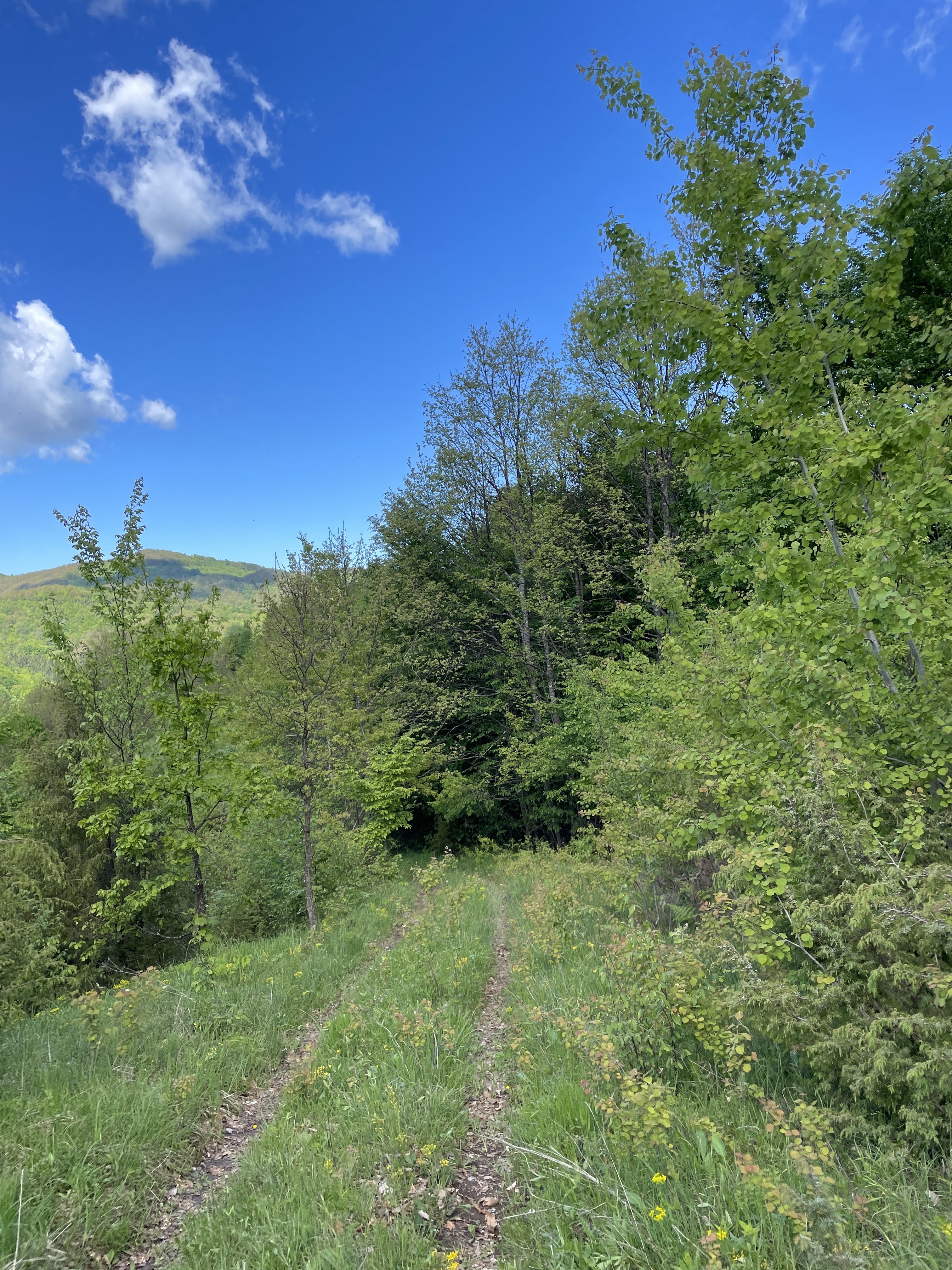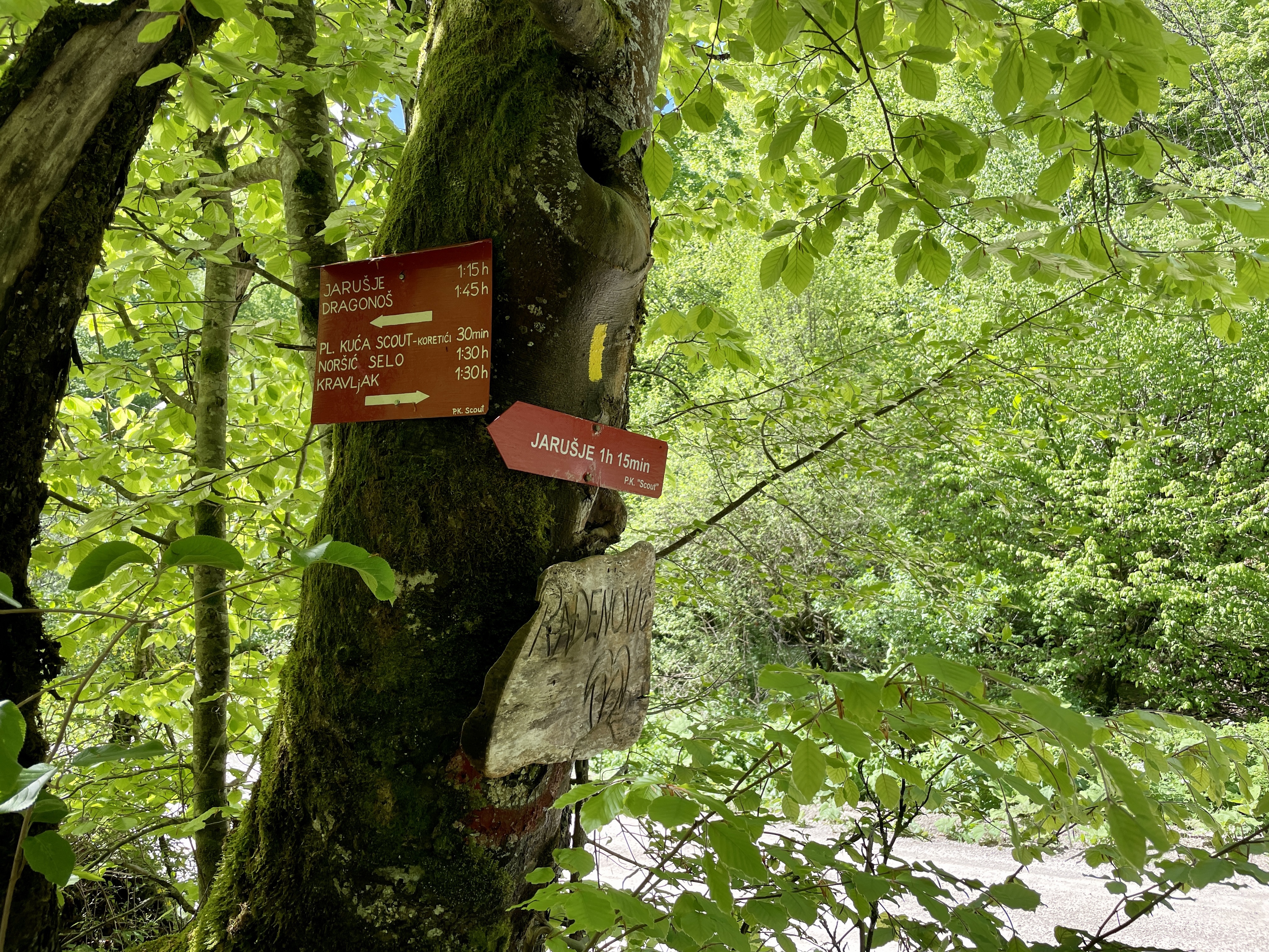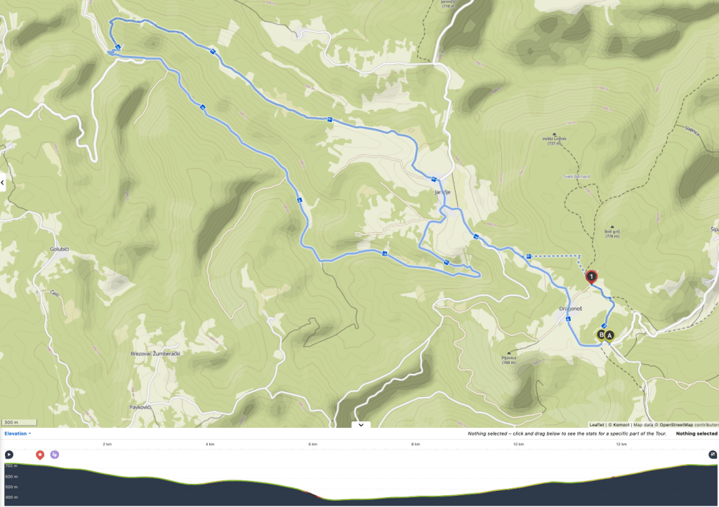 Početni dio laganog uspona je jedna od planinarskih staza koje vode prema Sv. Bernardu i Velikom Lovniku, no već nakon 800 metara smo napustili “poznate” puteve i prateći trag koji je osmislio Nikola Horvat Tesla, krenuli blatnim od jučerašnje kiše, šumskim putem, koji se negdje morao spojiti sa asfaltnom cestom od Dragonoša do Jarušja, što se i dogodilo nakon kilometra i pol hoda. Od tuda, prilično lagano niz nogu, nizbrdo sa početnih 745 m/nv, kroz Jarušje, pa preko cvjetnih livada, do vidikovca koji u stvari nije bio dio zamišljene rute, stigli smo do dosta strmog spusta, single trail stazom, koja nas je nakon 6,5 kilometara hodanja dovela do makadamske ceste, koja od Koretića vodi prema Šimrakima. Isti put se i odvaja prema Jarušju i Dragonošu, nešto užim, ali iznimno ugodnim makadamom, kojim sam i sam prošao prije nekoliko tjedana na jednoj od ruta biciklom. Na ovom mjestu smo dosegli najniži dio rute od 400 m/nv, i znali smo da nas čeka 8 kilometara laganog uspona na početnih 745 m/nv.