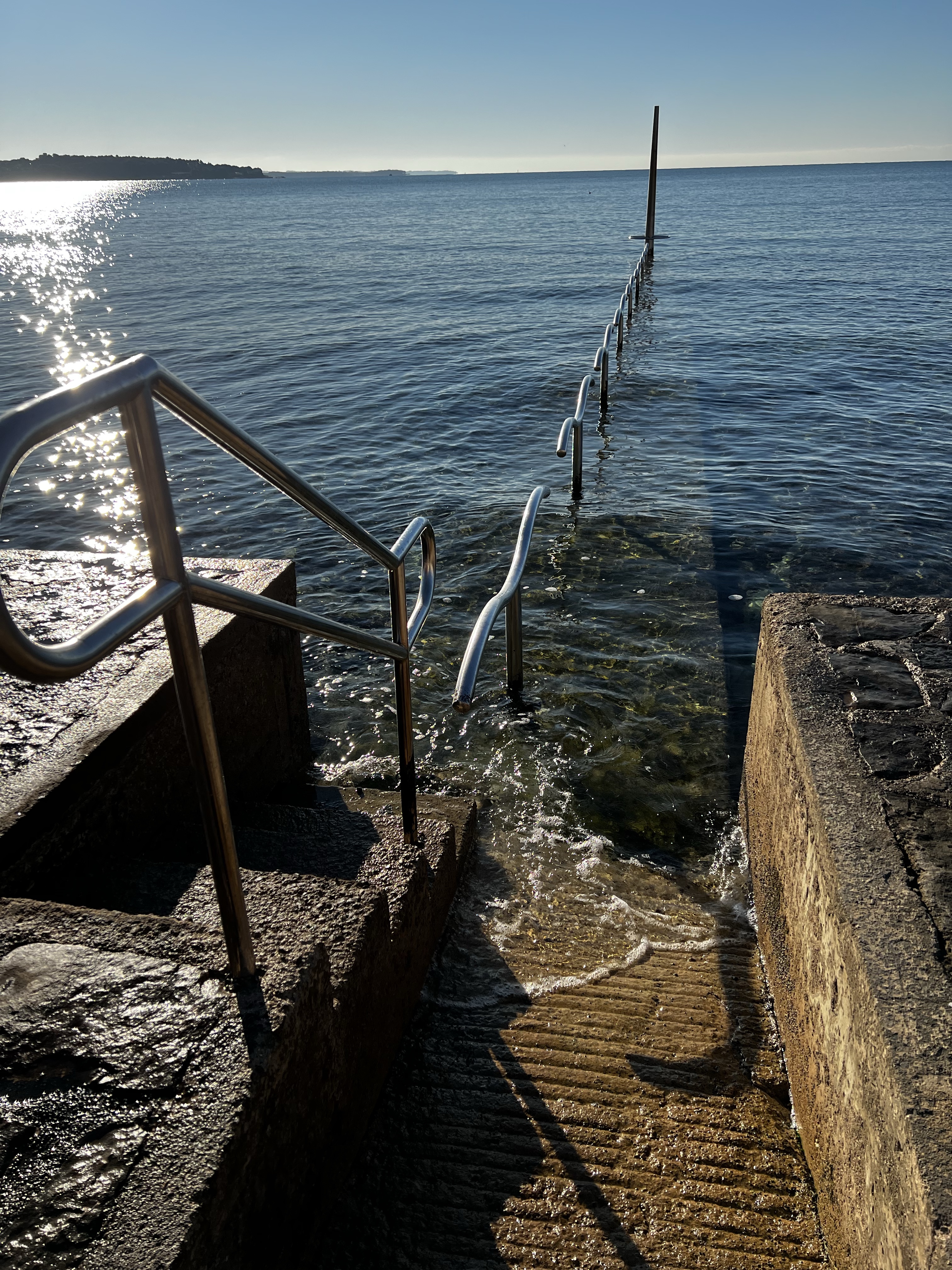 Prvo smo krenuli šetnicom prema Hotelu Aminess Maestral i Kampu Aminess Sirena. Plaža je kamena, manjim dijelom popločena, no bez većih narušavanja prirodne konfiguracije obalnog terena. Pažnju privlače neobične staze sa hvatištima za ulazak u more prilagođeni onima kojima je to potrebno, starijima i invalidima. Svaka čast!