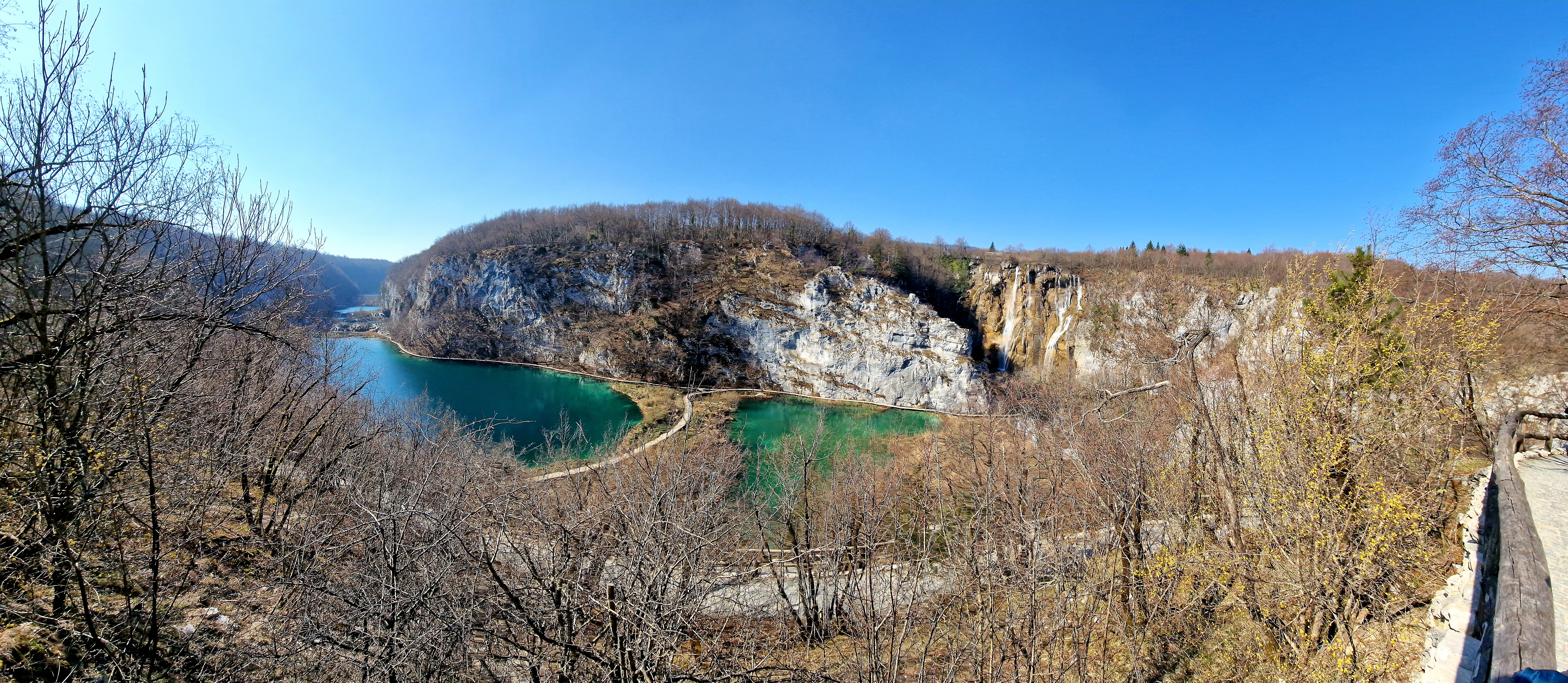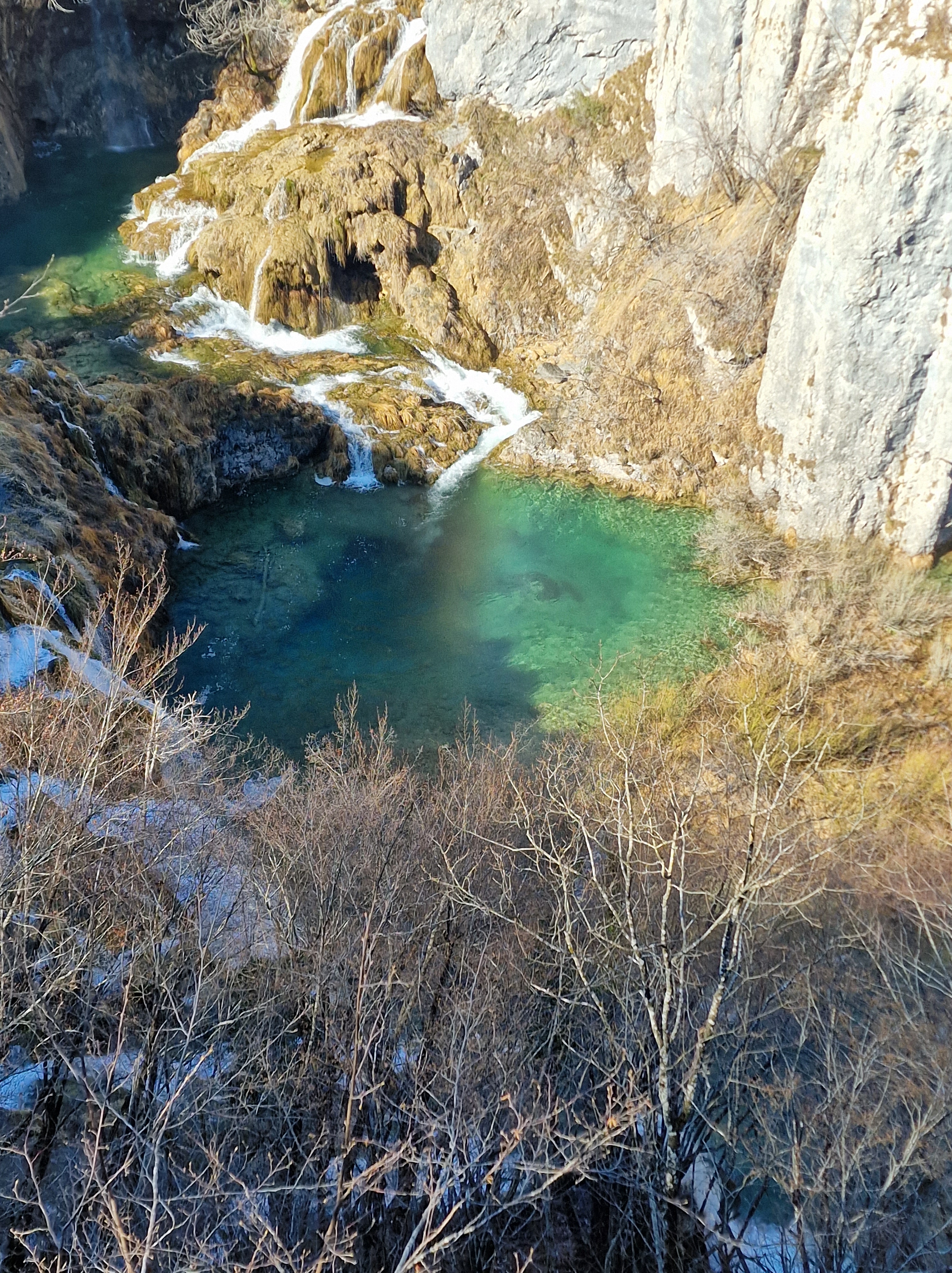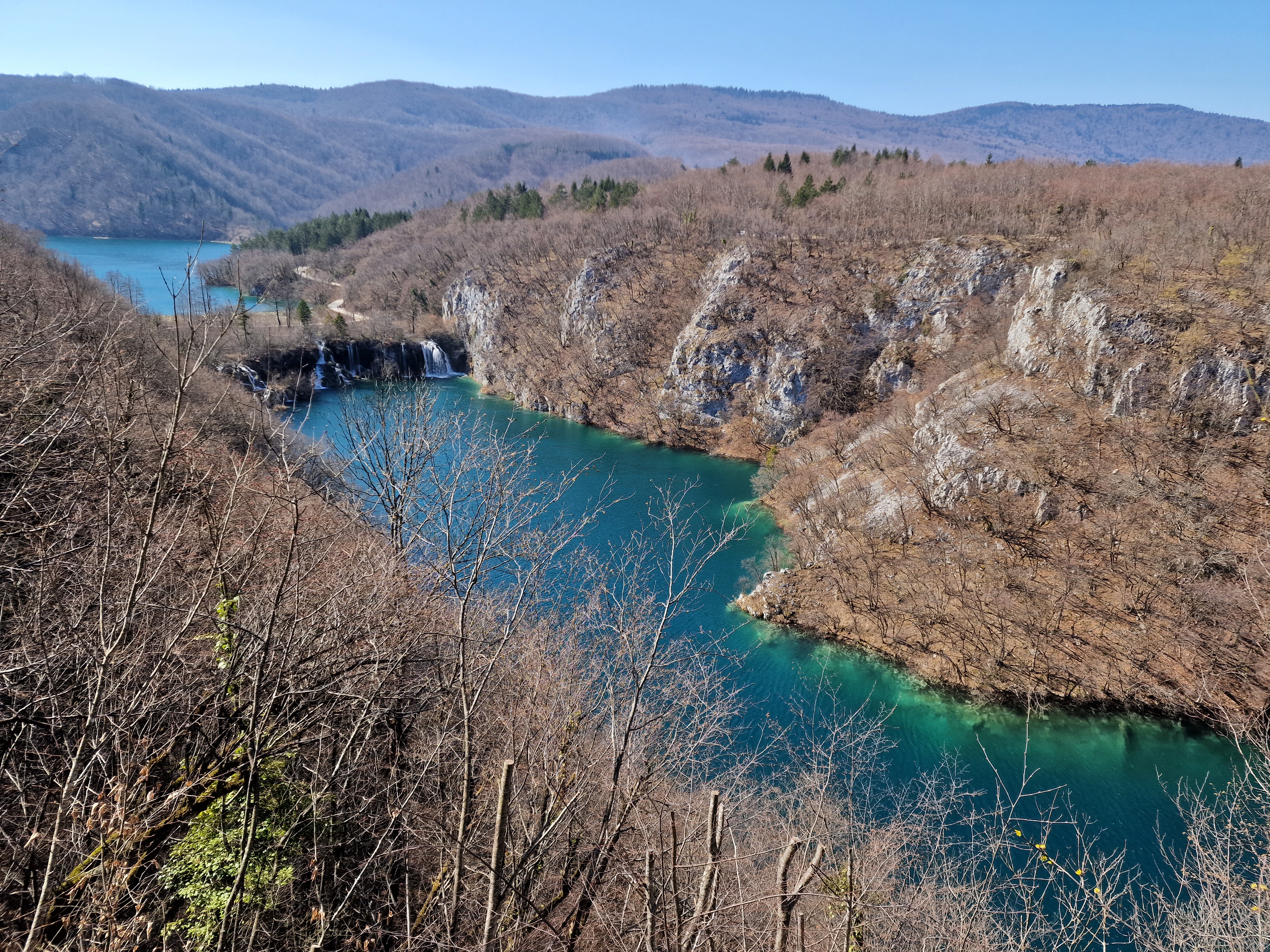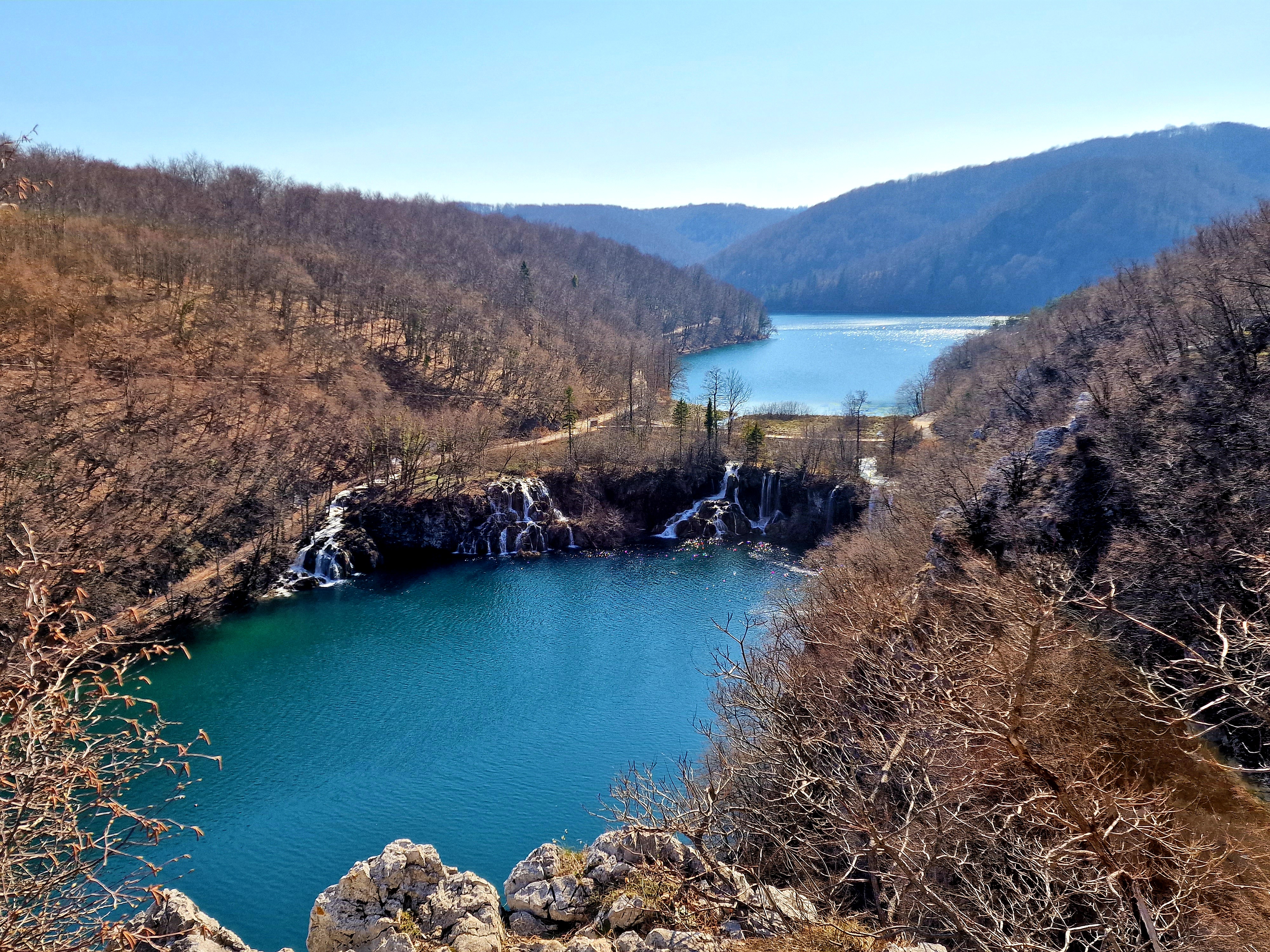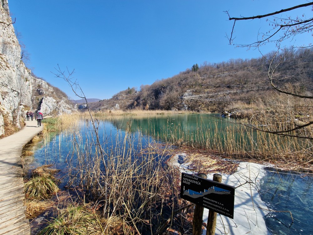 S obzirom da smo imali za obići otvorenih pet jezera, četiri iz donjeg toka, i Kozjak koji je najveći i posljednji od gornjih jezera koja su barem do 1. travnja zatvorena za posjetitelje, na gornjoj fotografiji se vidi malo jezero Novakovića Brod, koje je drugo najmanje, poslije najmanjeg Velikog Burgeta, i dubine svega 3 metra. Do njega se vidi, dostupno, Jezero Kaluđerovac, na 505 mnv, površine 2,1 ha i dubine do 13 metara. između njega i slapova prema Novakovića Brodu, postoji prekrasna šetnica drvenim oblucima i put prema Velikom Slapu.