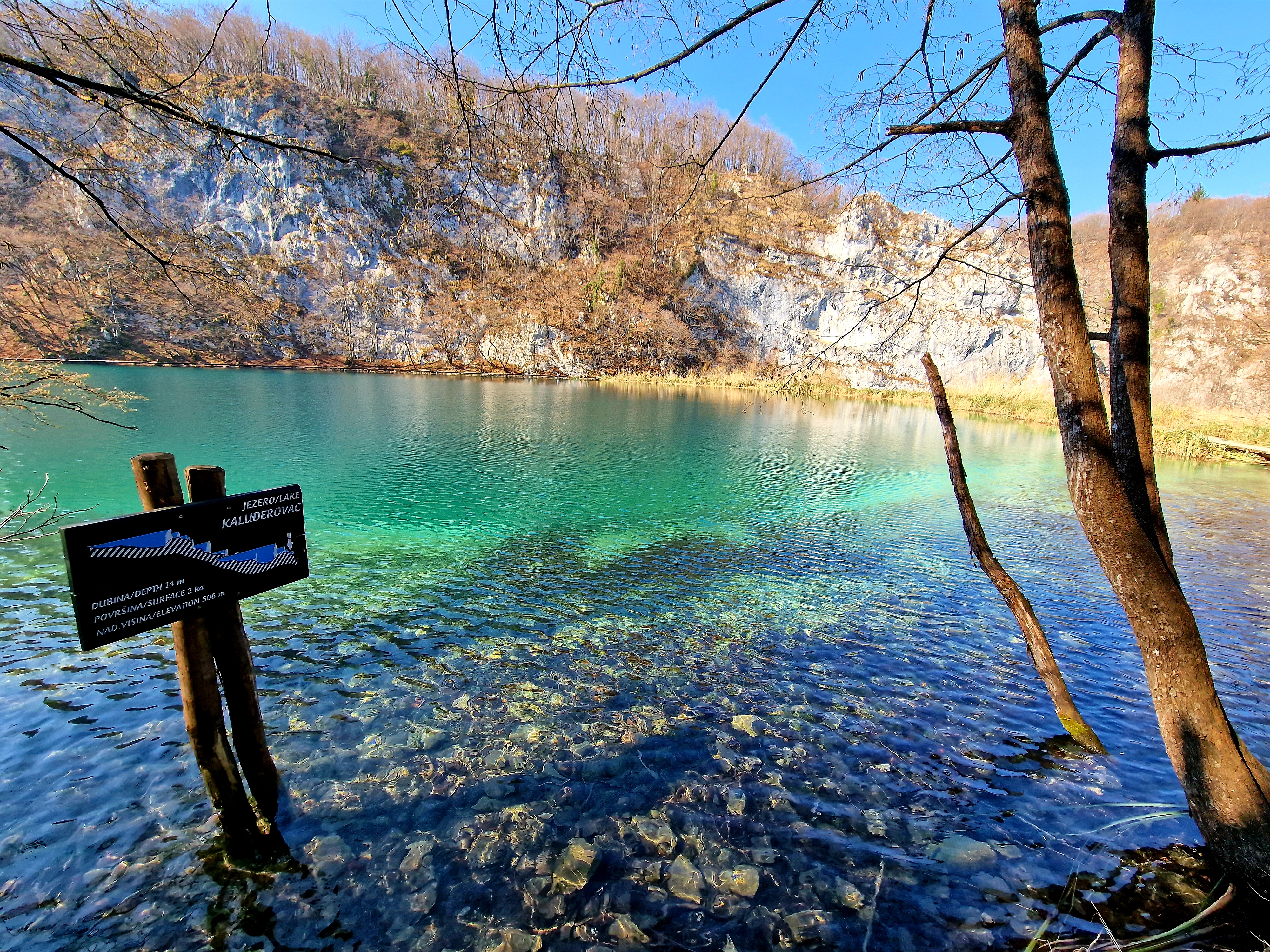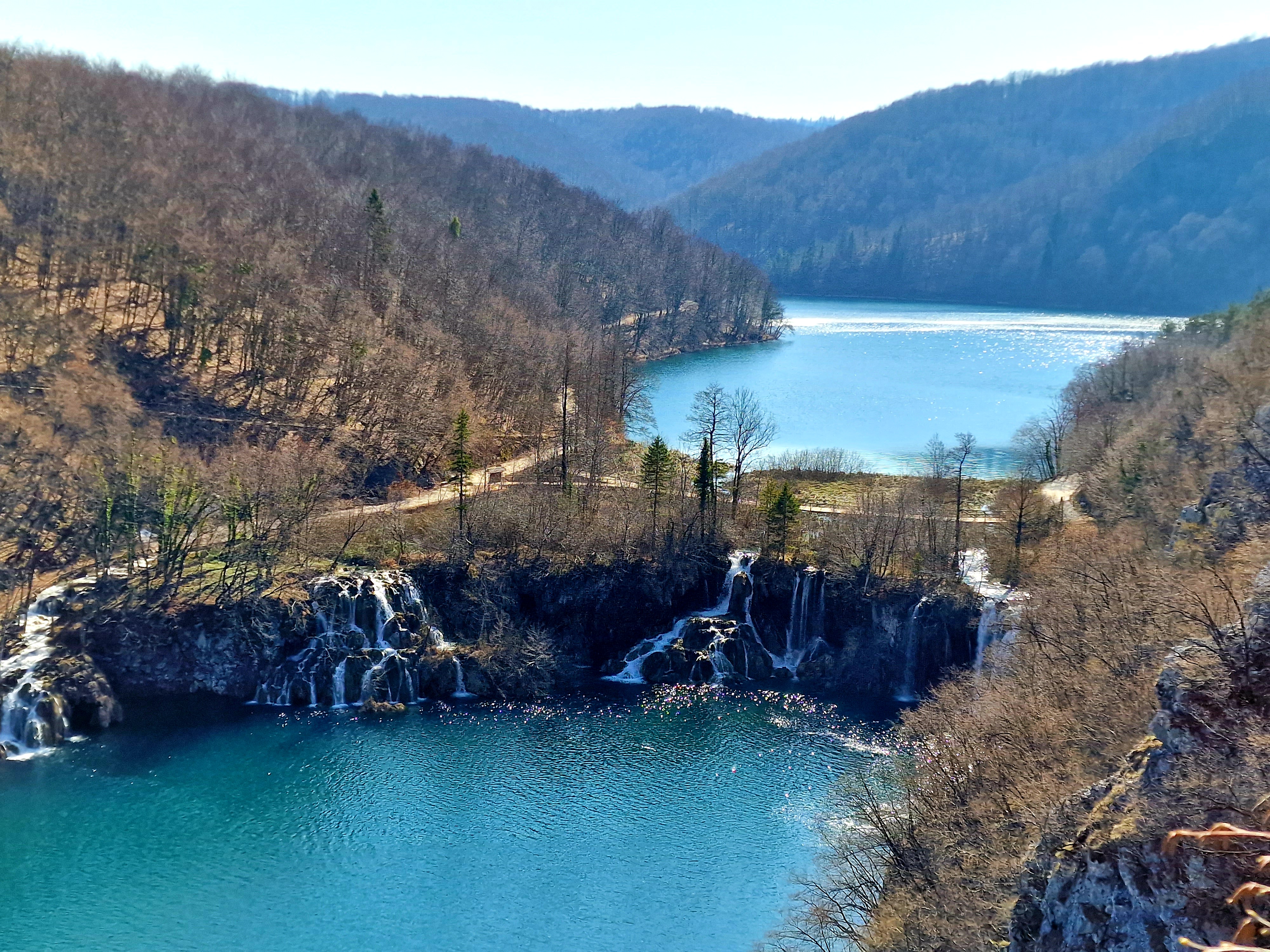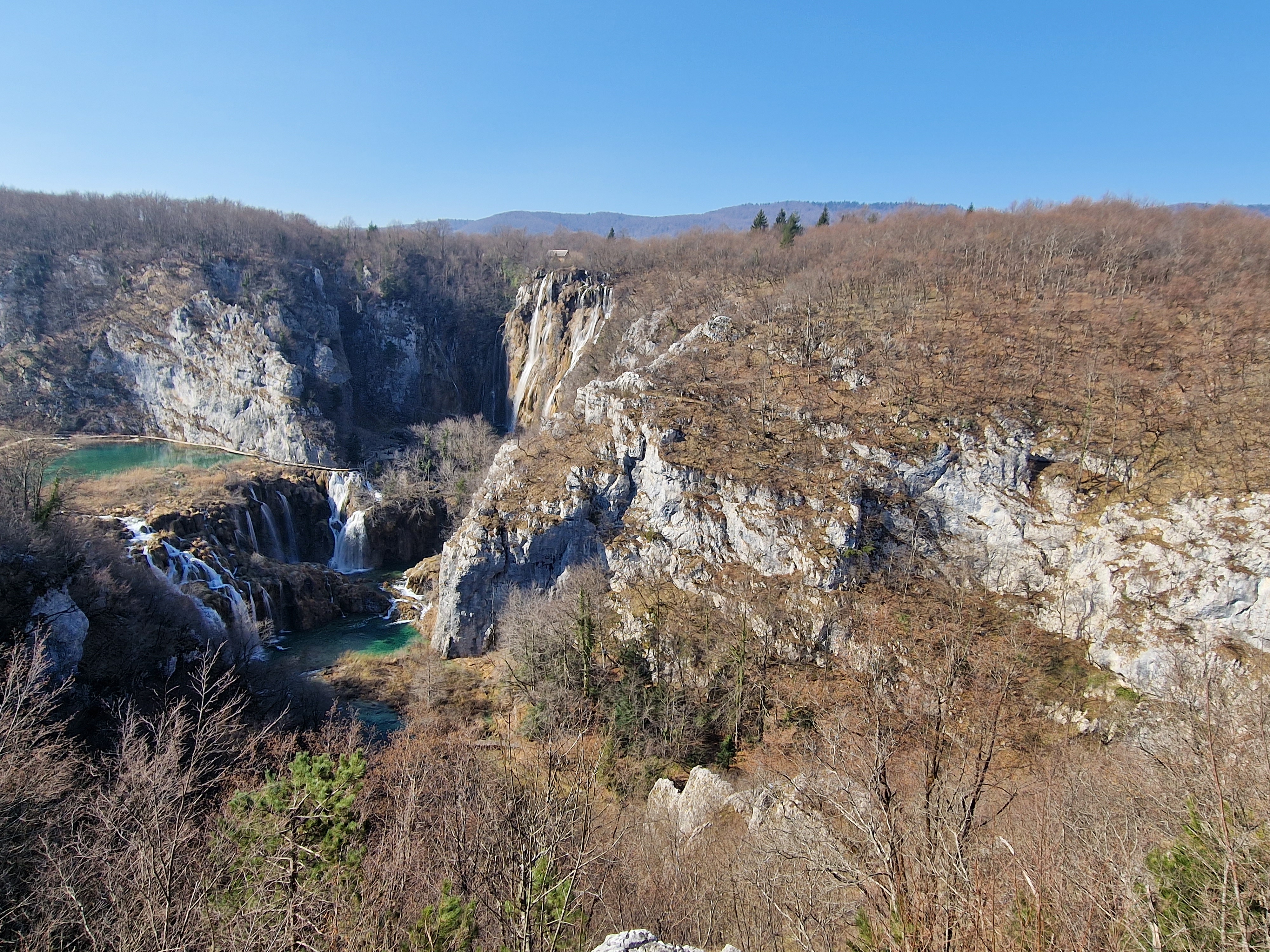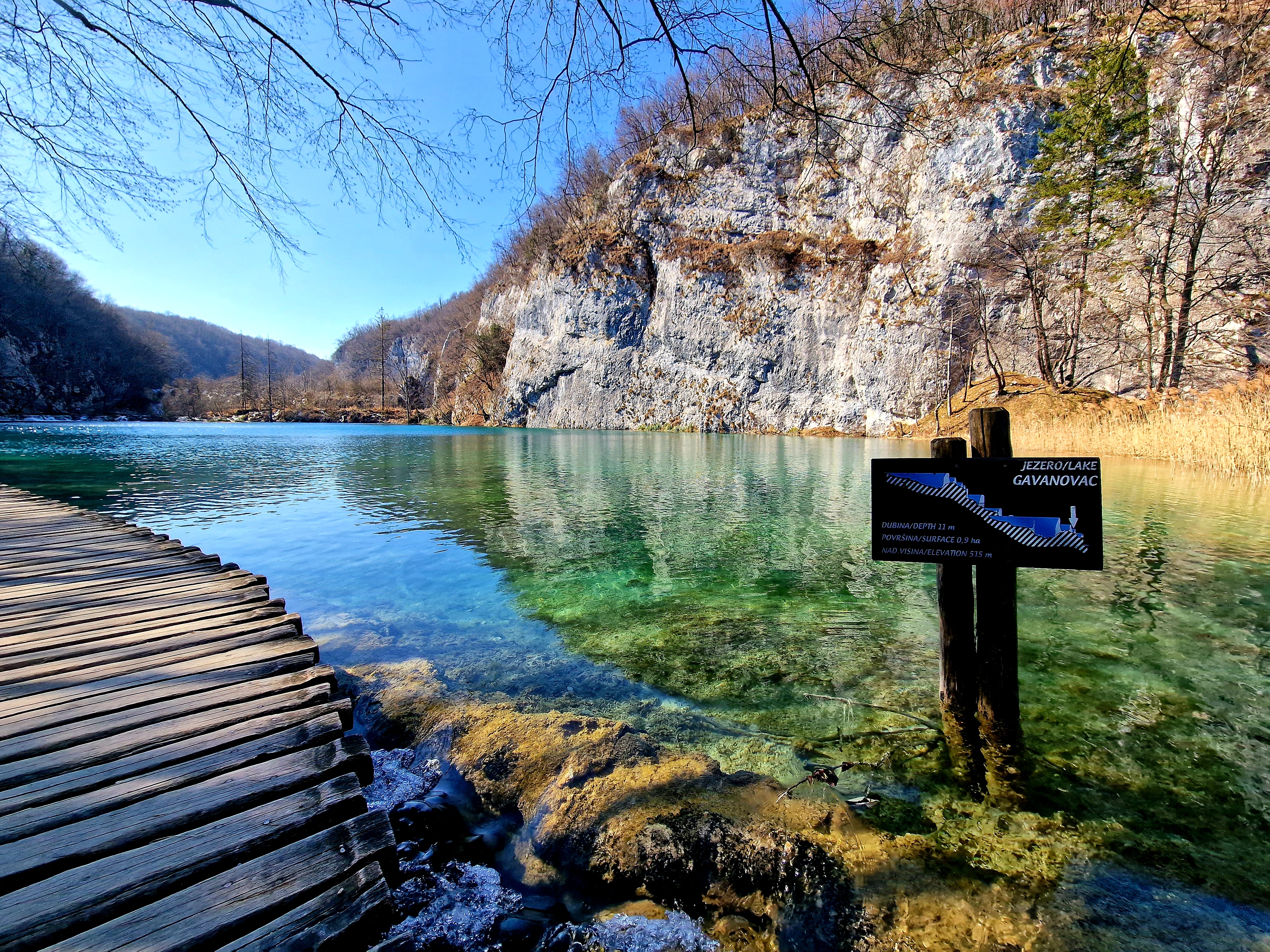 S obzirom da smo imali za obići otvorenih pet jezera, četiri iz donjeg toka, i Kozjak koji je najveći i posljednji od gornjih jezera koja su barem do 1. travnja zatvorena za posjetitelje, na gornjoj fotografiji se vidi malo jezero Novakovića Brod, koje je drugo najmanje, poslije najmanjeg Velikog Burgeta, i dubine svega 3 metra. Do njega se vidi, dostupno, Jezero Kaluđerovac, na 505 mnv, površine 2,1 ha i dubine do 13 metara. između njega i slapova prema Novakovića Brodu, postoji prekrasna šetnica drvenim oblucima i put prema Velikom Slapu.