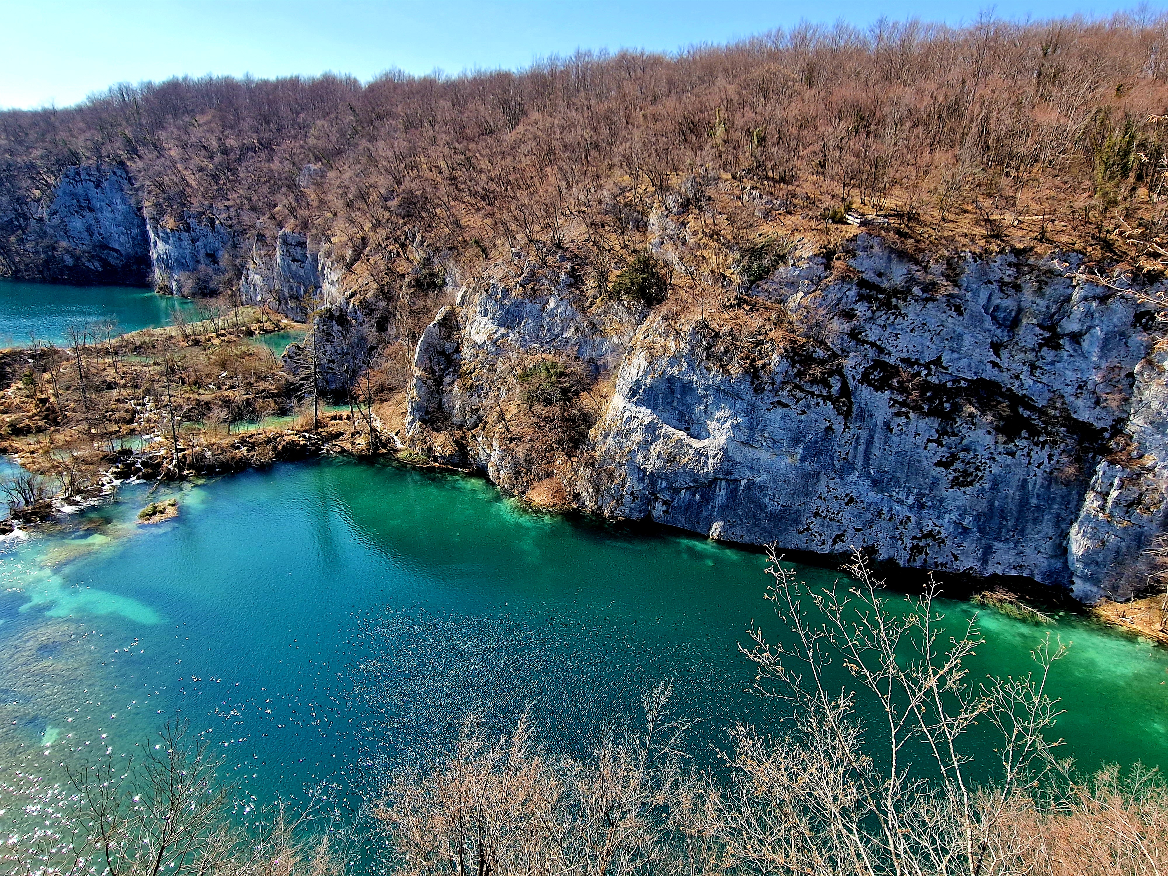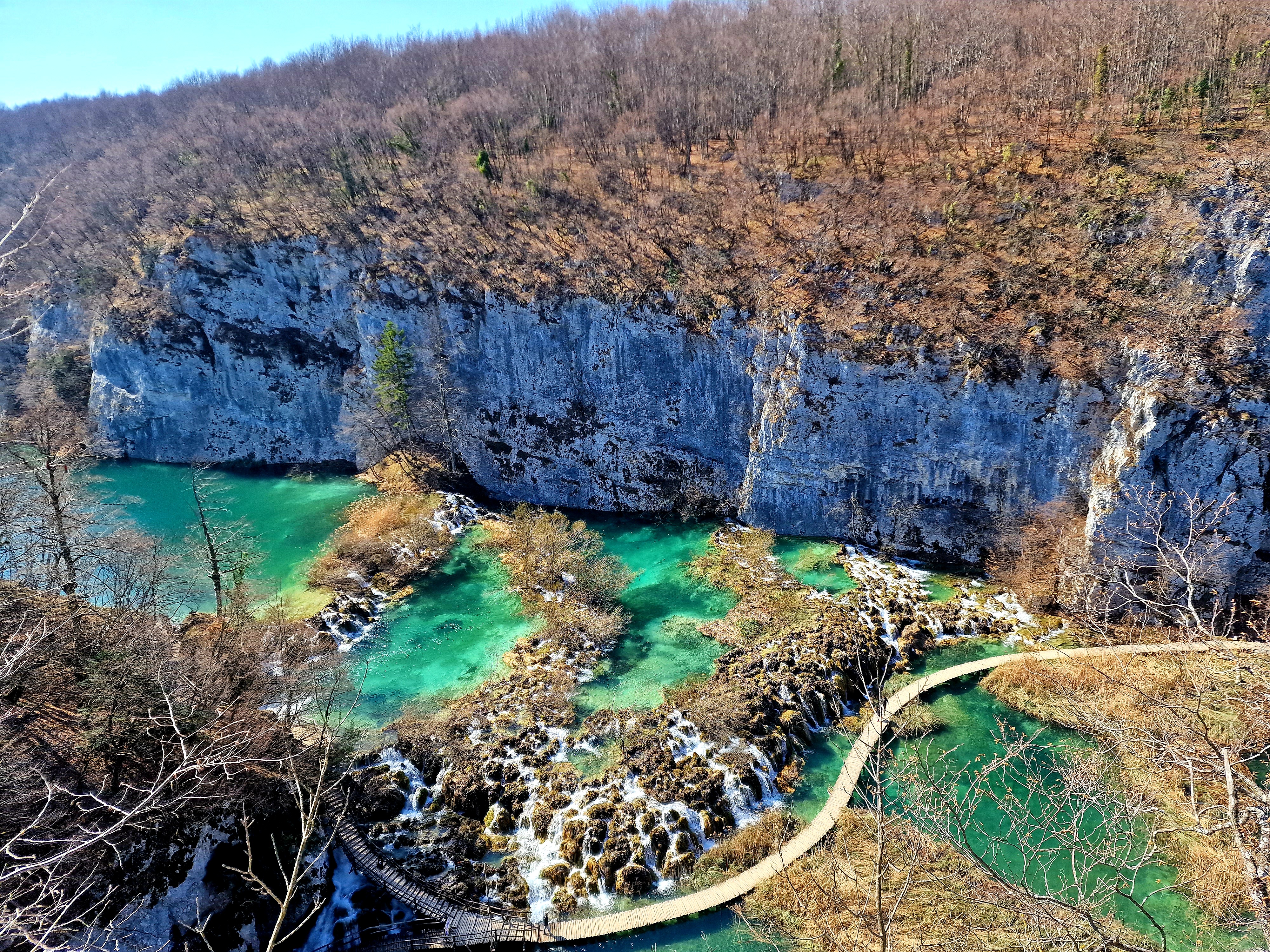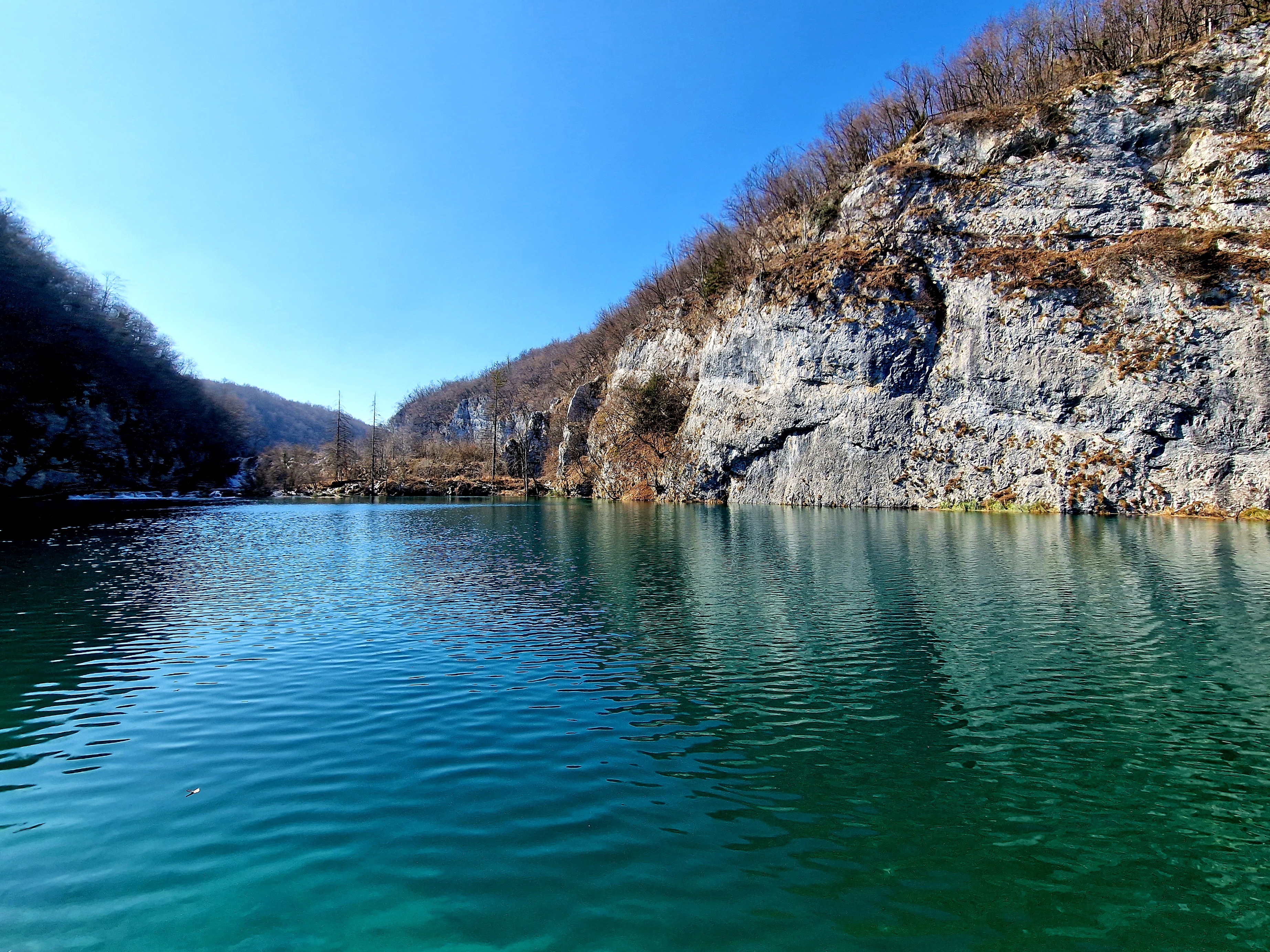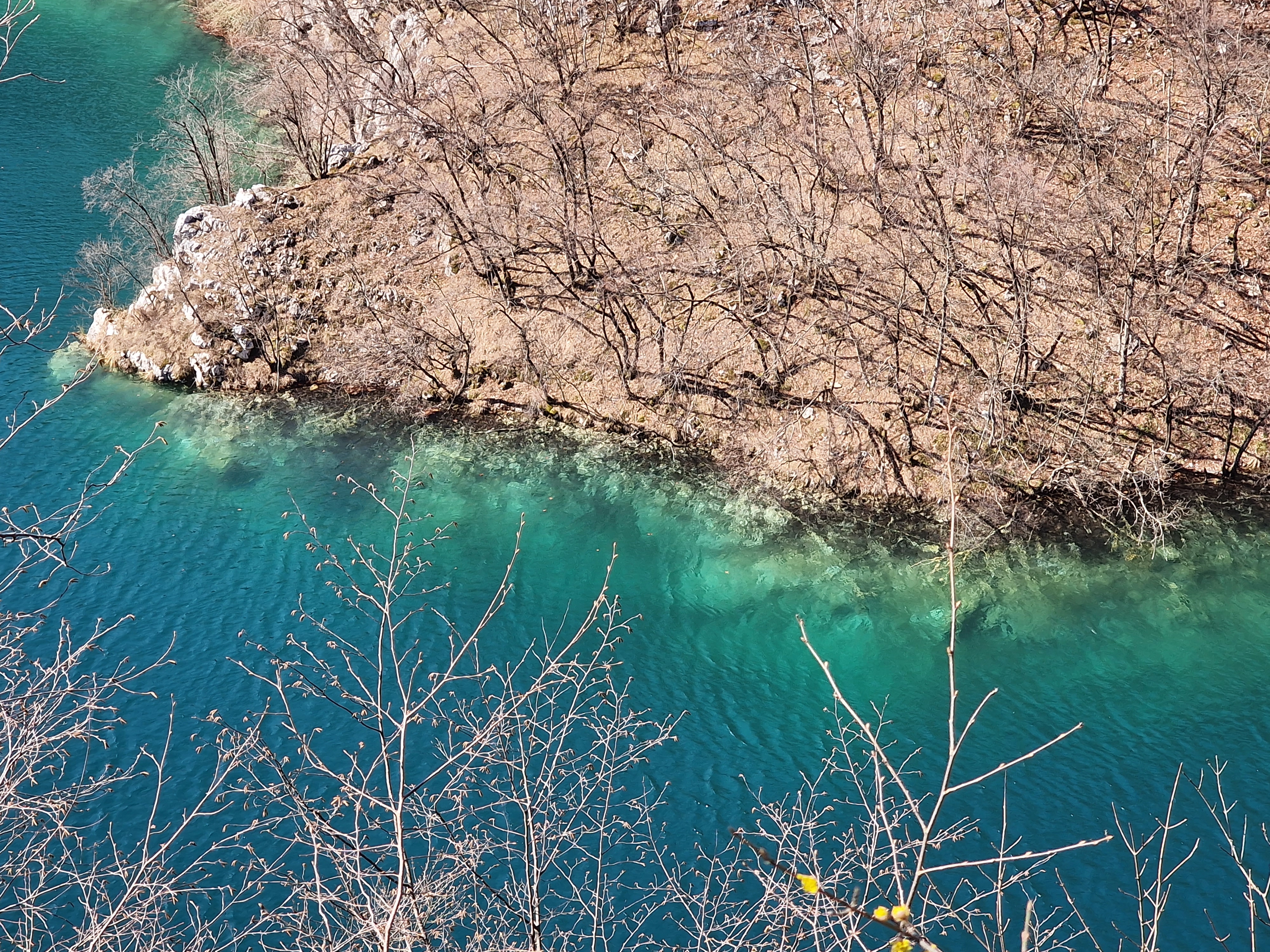 S obzirom da smo imali za obići otvorenih pet jezera, četiri iz donjeg toka, i Kozjak koji je najveći i posljednji od gornjih jezera koja su barem do 1. travnja zatvorena za posjetitelje, na gornjoj fotografiji se vidi malo jezero Novakovića Brod, koje je drugo najmanje, poslije najmanjeg Velikog Burgeta, i dubine svega 3 metra. Do njega se vidi, dostupno, Jezero Kaluđerovac, na 505 mnv, površine 2,1 ha i dubine do 13 metara. između njega i slapova prema Novakovića Brodu, postoji prekrasna šetnica drvenim oblucima i put prema Velikom Slapu.