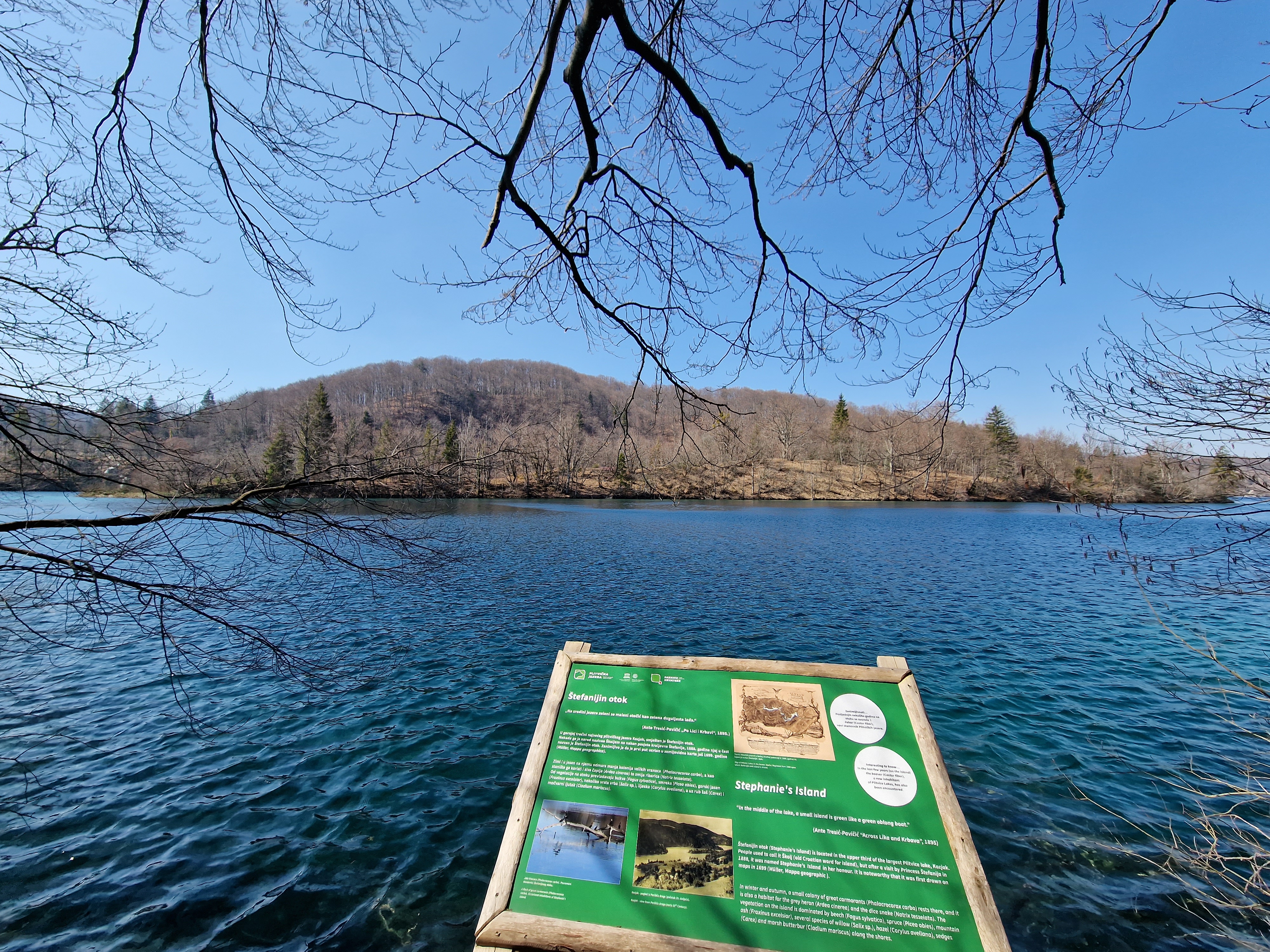 Nakon kratke okrjepe i kratkih nužnih potreba, jer ionako ništa drugo nije otvoreno (niti kavu ne možete popiti), odlučili smo se uputiti tzv. stazom K, iako je moguće ići samo stazama B, koje obuhvaćaju kompletna donja jezera, no staza K je kompletna staza od preko 18 kilometara kojom bi se išlo bez vožnje brodom, da su otvorena i gornja jezera (osim Kozjaka, koji je otvoren). Ta staza je zanimljiva, jer vodi pored jedinog otoka u jezeru Kozjak – Štefanijinog otoka. Štefanijin otok je hrvatski jezerski otok. Nalazi se usred jezera Kozjaka na Plitvičkim jezerima, u istoimenom nacionalnom parku. Okružen je jezerom Kozjakom koje je kao sva iz skupine Gornjih jezera, veće i dublje, nastalo u otvorenoj dolini u trijaskim dolomitima. Narod je nekada ovaj otok zvao Školjem, no nakon posjete kraljevne Štefanije, 1888. g. njoj u čast je nazvan Štefanijin otok. Prvi puta je ucrtan u zemljovide još 1699. godine. Na njemu boravi manja kolonija velikih vranaca, a i poneka siva čaplja, te zmija ribarica.