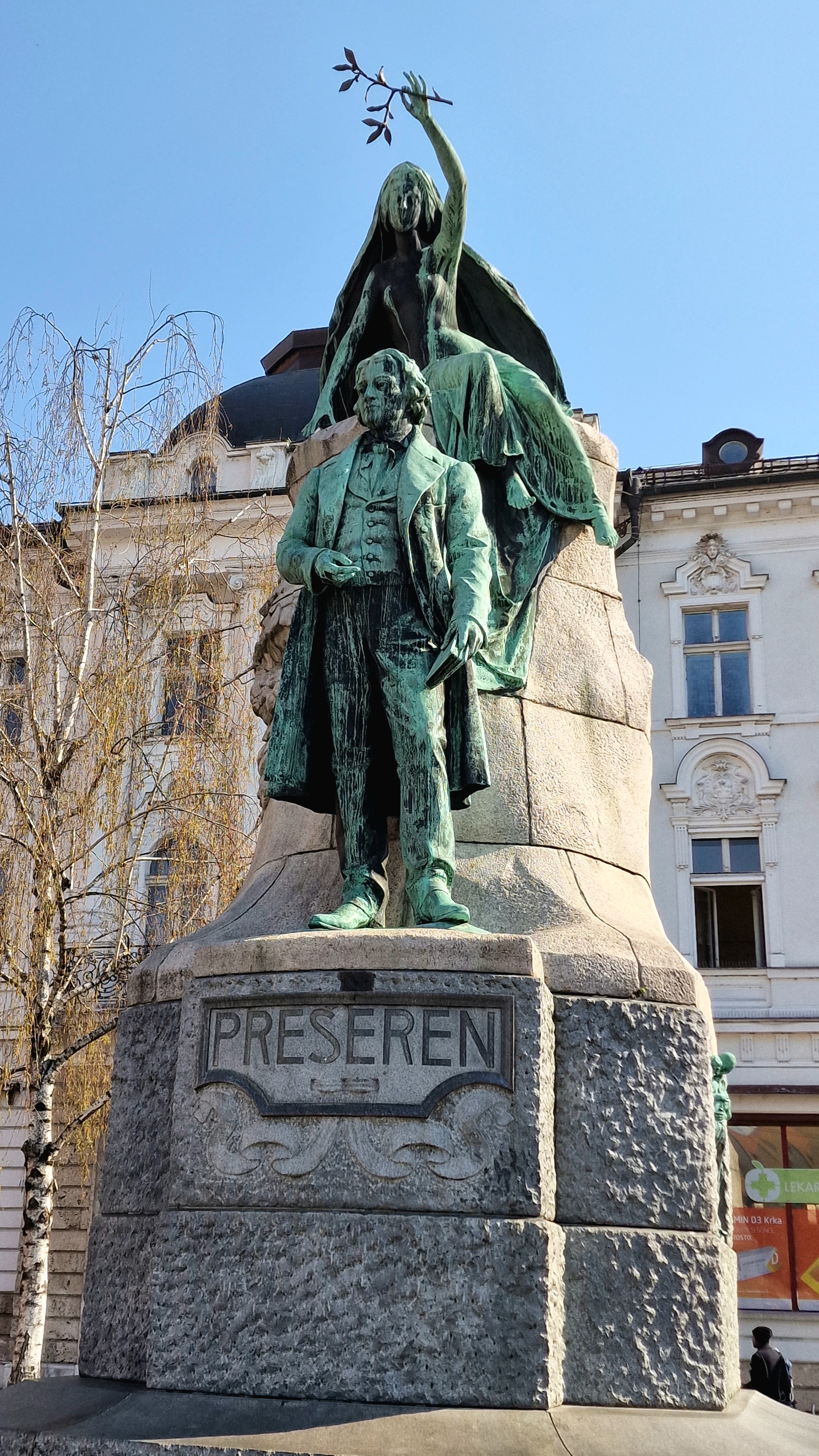 Prošli smo i pored velikog spomenika Francu Prešernu. France Prešeren (izgovara se [fɾanˈtsɛ pɾɛˈʃeːɾən] (2. ili 3. prosinca 1800. – 8. veljače 1849.) bio je pjesnik iz 19. stoljeća, čije su poeme mnogi romantičarski poeti prevedeli na mnoge jezike. Smatran je najvećim slovenskim klasičnim pjesnikom i nadahnuo je kasniju slovensku književnost. Napisao je prvu slovensku baladu i prvi slovenski ep. Nakon njegove smrti, postao je vodeće ime slovenskog književnog kanona.
