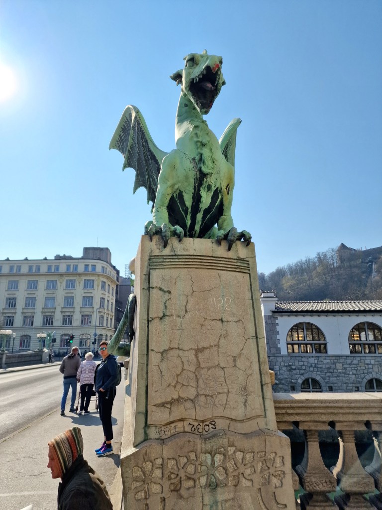 Kao što sam rekao, nakon parkiranja nedaleko Kongresnog trga, u podzemnoj garaži, krenuli smo ravno do rijeke Ljubljanice i mnogih mostova, koji su gotovo na svakih stotinjak metara, spajajući predivno uređene obale, danas sunčanih terasa, prepunih turista i studenata, s obzirom na blizinu svih fakulteta. No, mene je prvo zanimao poznati ljubljanski zmaj.