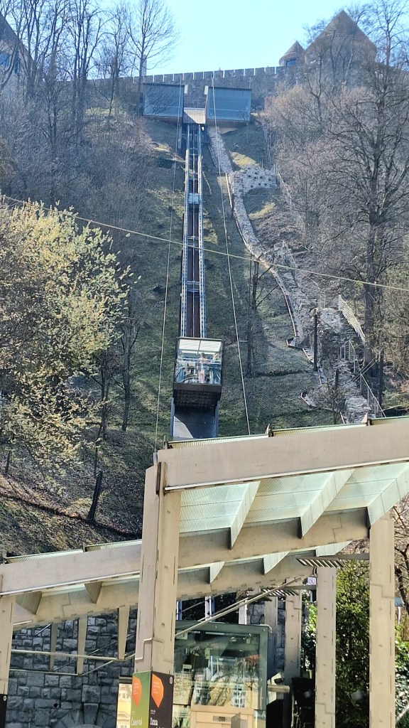 S obzirom da je došlo vrijeme ručka, a odlučili smo ručati negdje na Starom trgu, jednoj tradicionalnoj starogradskoj ulici, koja vodi do podnožja starog grada, za koji sam online kupio ulaznice, kao i za žičaru, kojom se ide lakše uzbrdo. Velika Prešernova ljubav je bila Julija Primić, po kojoj je nazvan restoran u kojem smo pojeli odličnu tjesteninu i rižoto, uz čašu poznatog crnog vina.