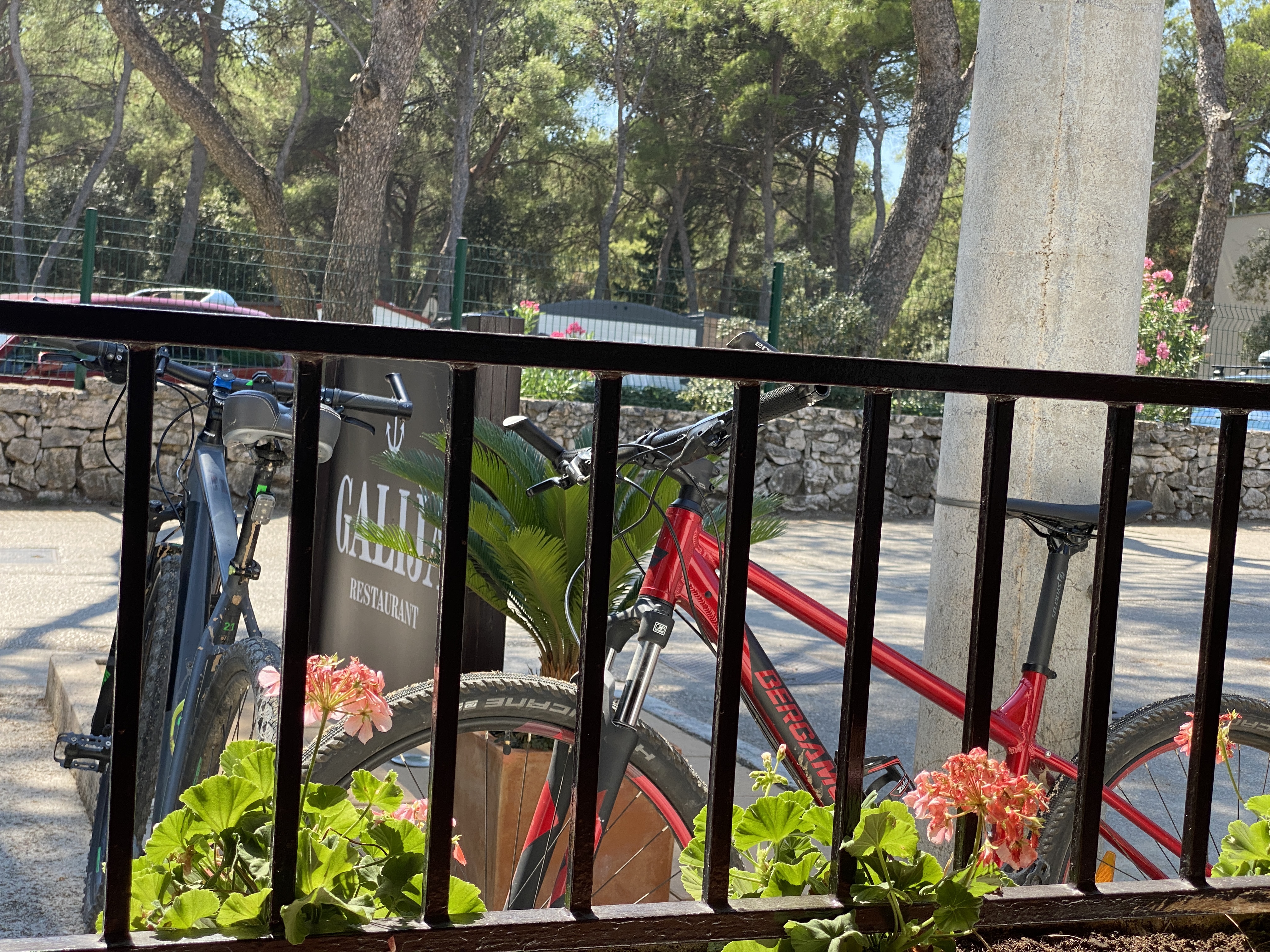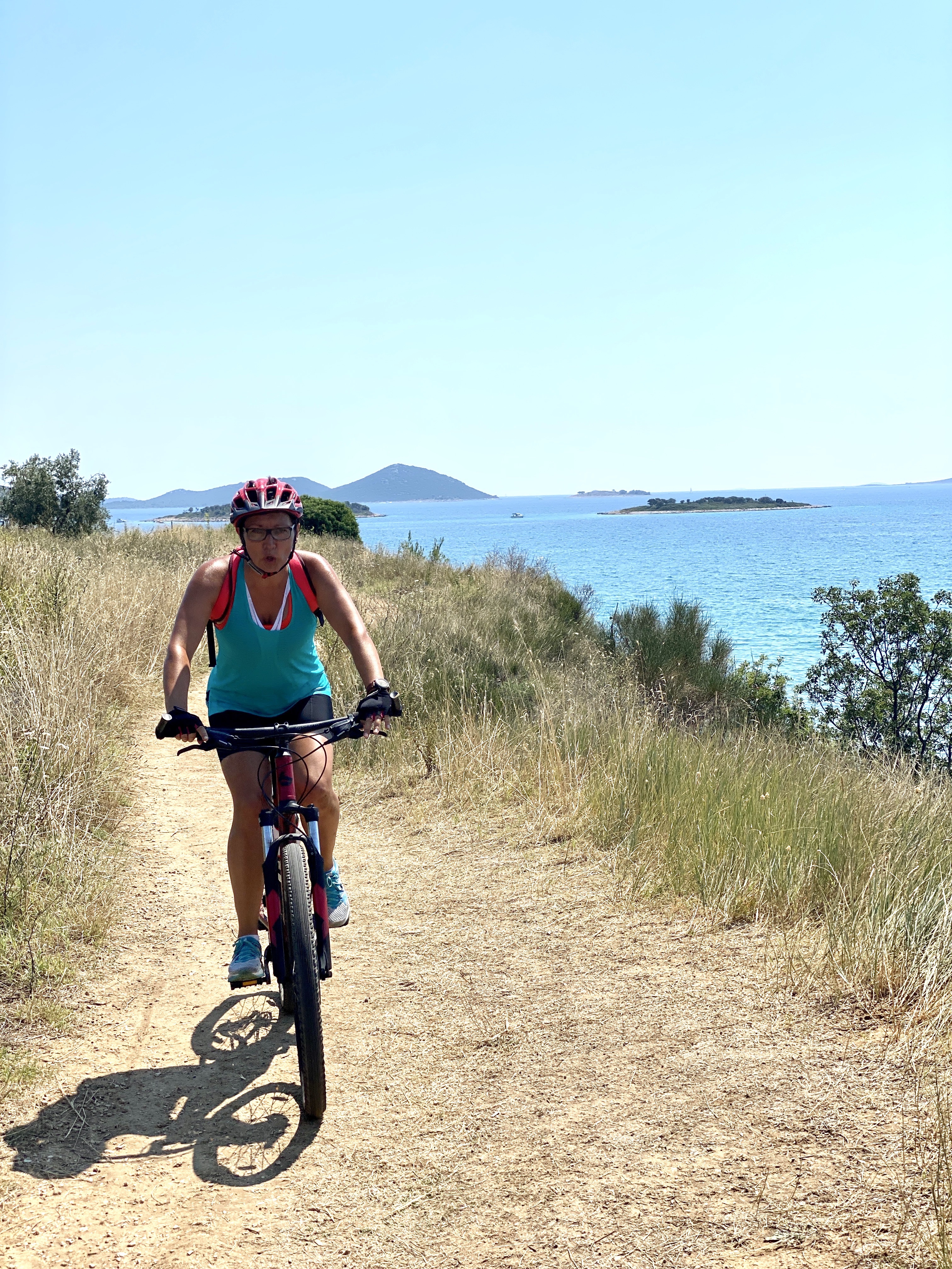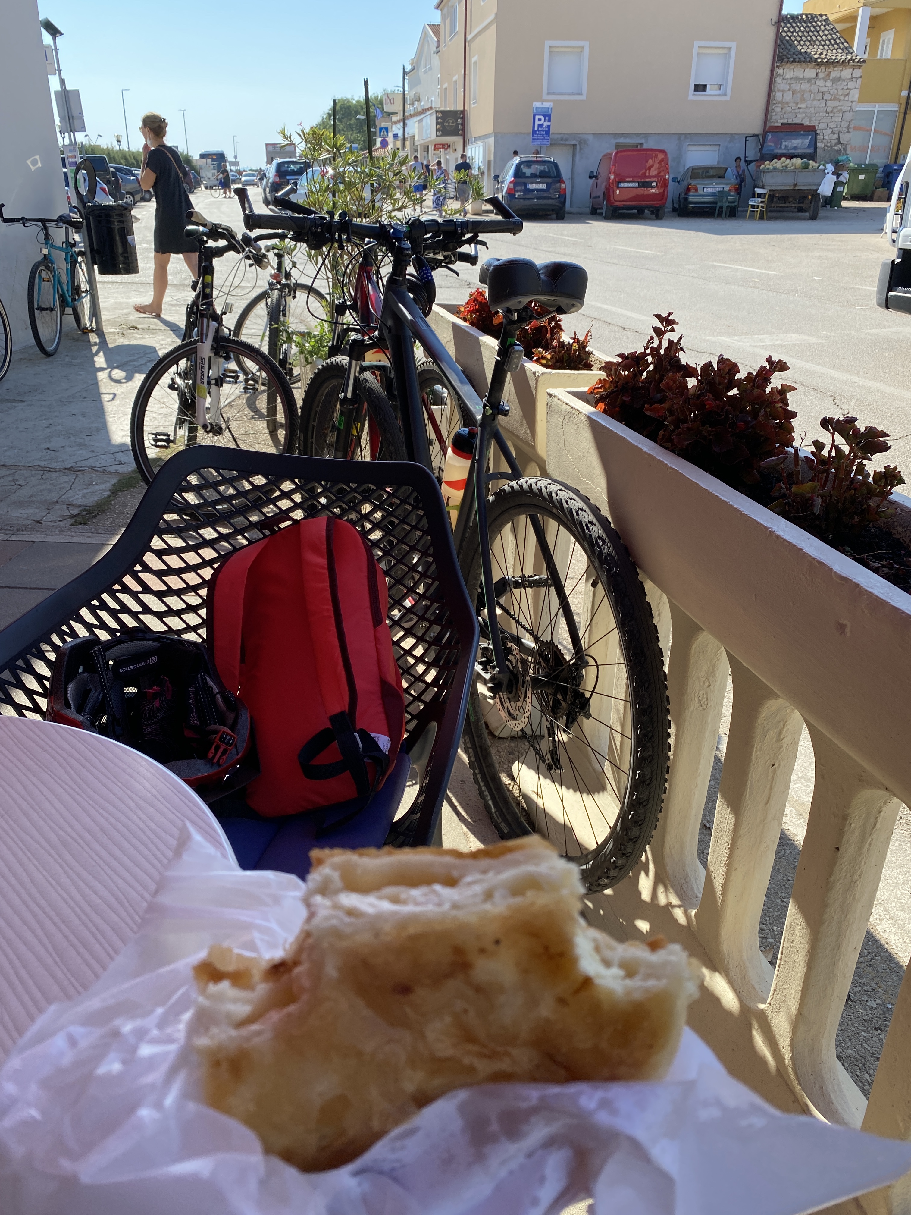 Na singliću uz more, veselila je činjenica da smo vidjeli nekoliko privatnih kampova sa predivnim kućicama za obitelji, a vidjeli smo i jedan glamping kamp. Glamping, odnosno ‘glamurous camping’ iliti glamurozno/luksuzno kampiranje, kao pojam pojavio se sasvim nedavno. Takav način odmora spaja klasično kampiranje u prirodi sa svim (ili barem gotovo svim) pogodnostima doma ili apartmana i moderne tehnologije. Neki bi rekli da se time gubi čar i uopće smisao boravka u prirodi i povezivanja s istom, no u svakom se slučaju ovako rodio novi način ljetovanja i odmora općenito. Koncept uglavnom predviđa ili potpuno opremljene montažne drvene kućice ili veće šatore sa čvrstom podlogom u kojima nikakve vremenske neprilike ne mogu poremetiti vaš spokoj. Na 50. kilometru smo dohvatili Pakoštane. Bilo je krajnje vrijeme za punjenje baterija u ovom izuzetno vrućem danu, što je podrazumjevalo i neko hranjenje, jer smo ispraznili i skurili preko 1500 kcal.