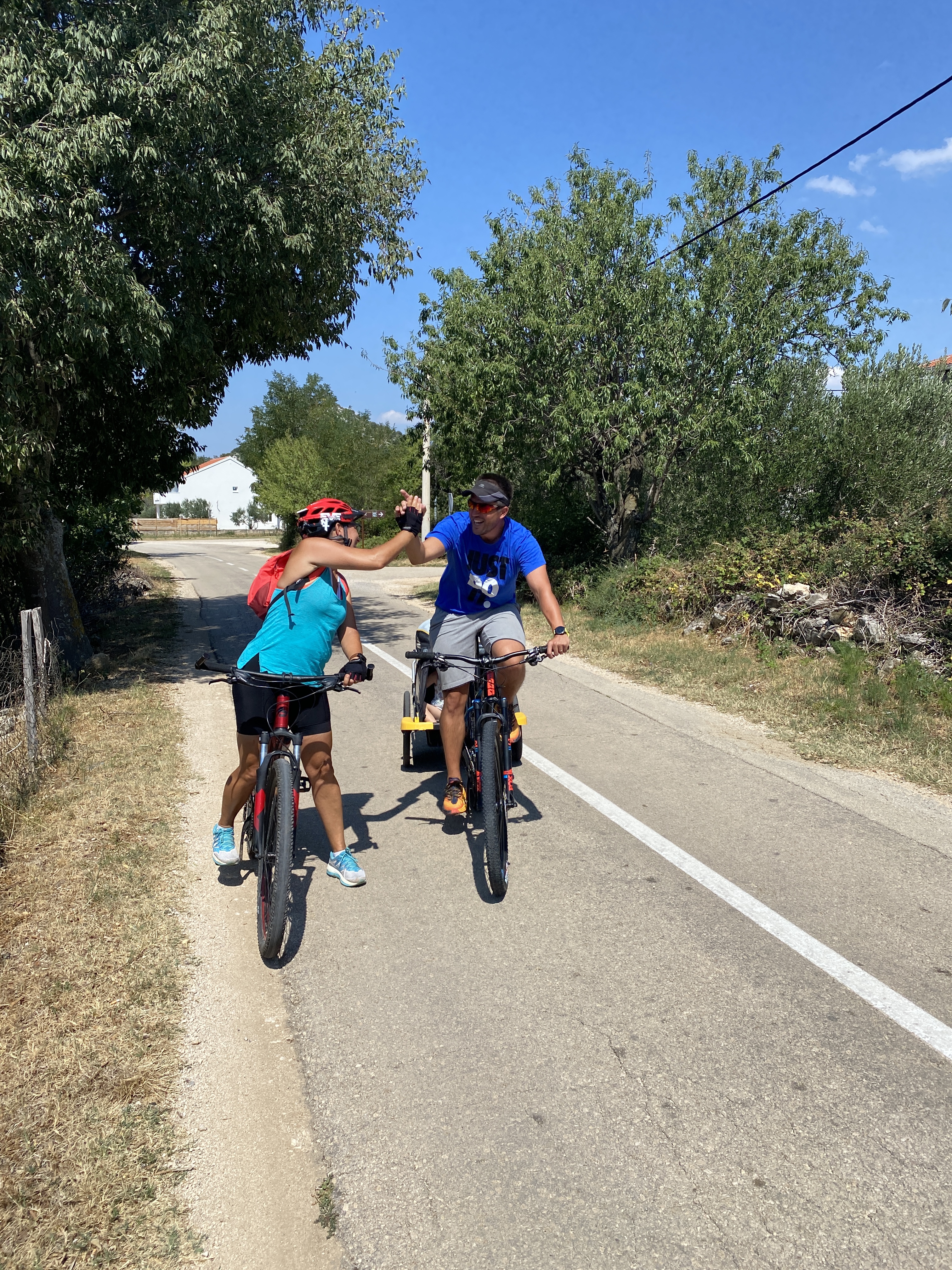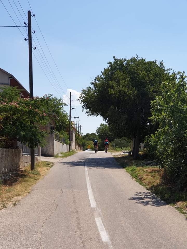 Uslijedio je uspon koji nas je podsjetio na zagorske brege, po pravoj asfaltnoj cestici u zaleđu, gdje su zaseoci vrlo rijetki i sa malo kuća. Prošli smo skretanje prema Zelićima, samo mjesto Radašinovci, gdje je uslijedio kontakt sa Matijom, koji je sa malom Tonkom u rikši na svom Giantu, krenuo nama u susret. Plan je bilo stajanje u Banjevcima, legendarnom mjestu kroz koje svako ljeto prođe mnogo trkača i biciklista koji se zateknu u blizini, na obali, jer ne mogu ne svratiti kod ovog iznimno srdačnog domaćina.