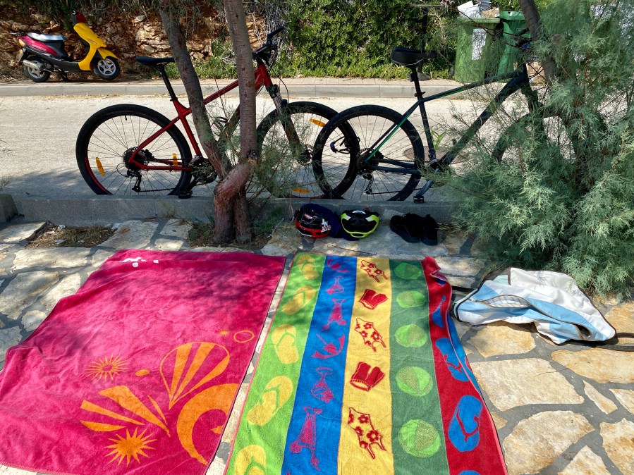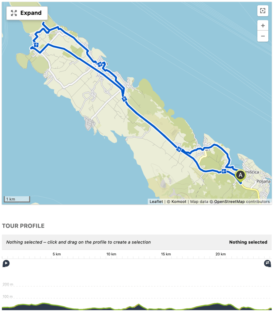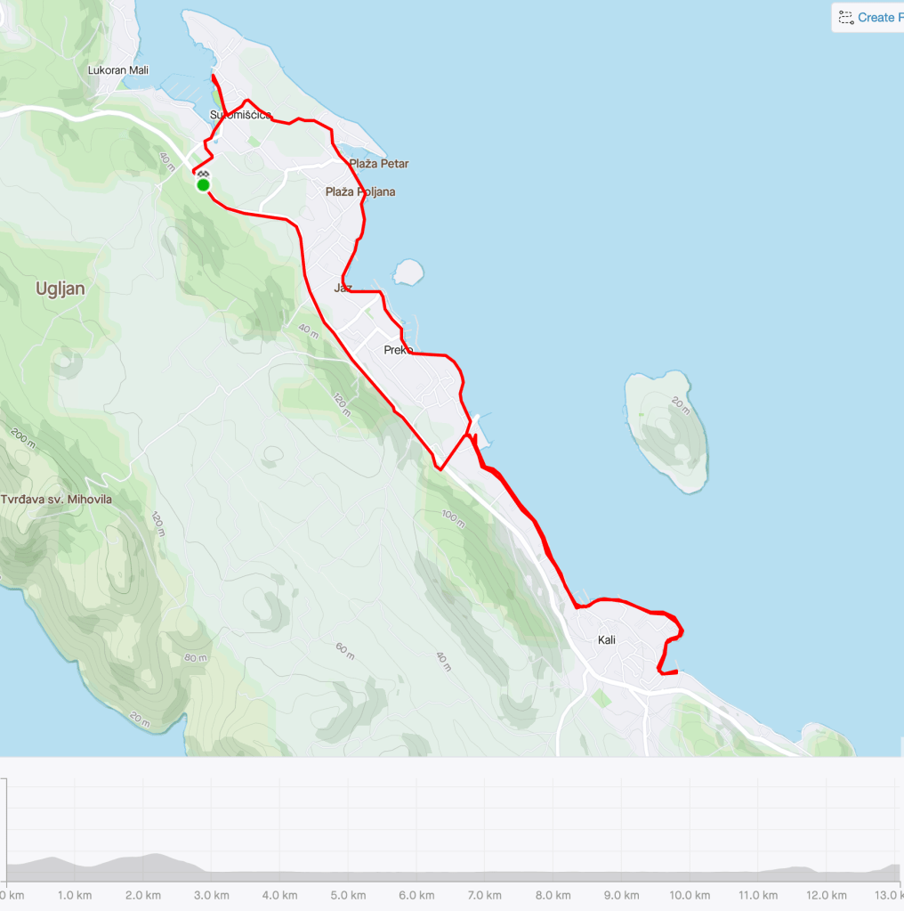 Pauza je trajala taman toliko da se presvučemo, istuširamo i već smo krenuli na drugu današnju “rutu”, koja možda to i nije, no ozbiljno shvaćamo odlazak na ručak u Kali, u omiljeni Srdela Snack. Išli smo glavnom cestom djelomično, do skretanja za trajektno pristanište Preko, a onda uz plažu, obalnom cestom sve do restorana, gdje nas već znaju, a i mi njih, no nismo jedini, i danas je bila baš velika gužva. To ne čudi s obzirom na odlične cijene i svježe i ukusno spremljene jednostavne zalogaje. Nakon obroka, samo nekoliko stotina metara dalje smo zalegli na gradskoj plaži uz Beach Bar Mavra. Uslijedio je povratak uz obalu i još jedna kavica i kupanje uz naš lokalni bar na plaži u Sutomišćici. Prva ruta danas 24,4 km sa 260 visinske, druga 13 km sa 76 m visinske. Od ponedjeljka, dakle za 5 dana, 204 kilometra sa 2035 metara uspona. Ponosan!